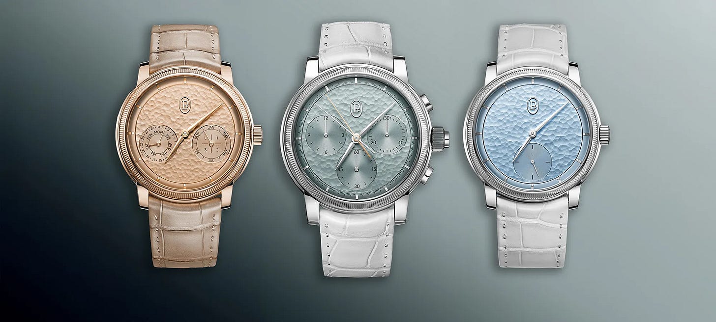 Parmigiani’s Toric Anniversaire collection celebrates 30 years with limited editions built around hand-hammered gold dials, making each example subtly unique. The range spans from simpler time-only elegance to heavy complication territory, presenting the brand’s full spectrum of finishing and mechanical ambition. The story frames the releases as collector-oriented, emphasizing precious materials, traditional craft, and restrained design language rather than loud novelty. Price range is approximately $98,160 to $206,790 (converted from CHF 75,000 to CHF 158,000).