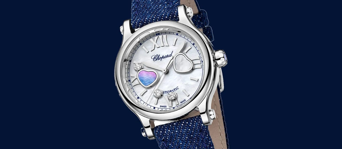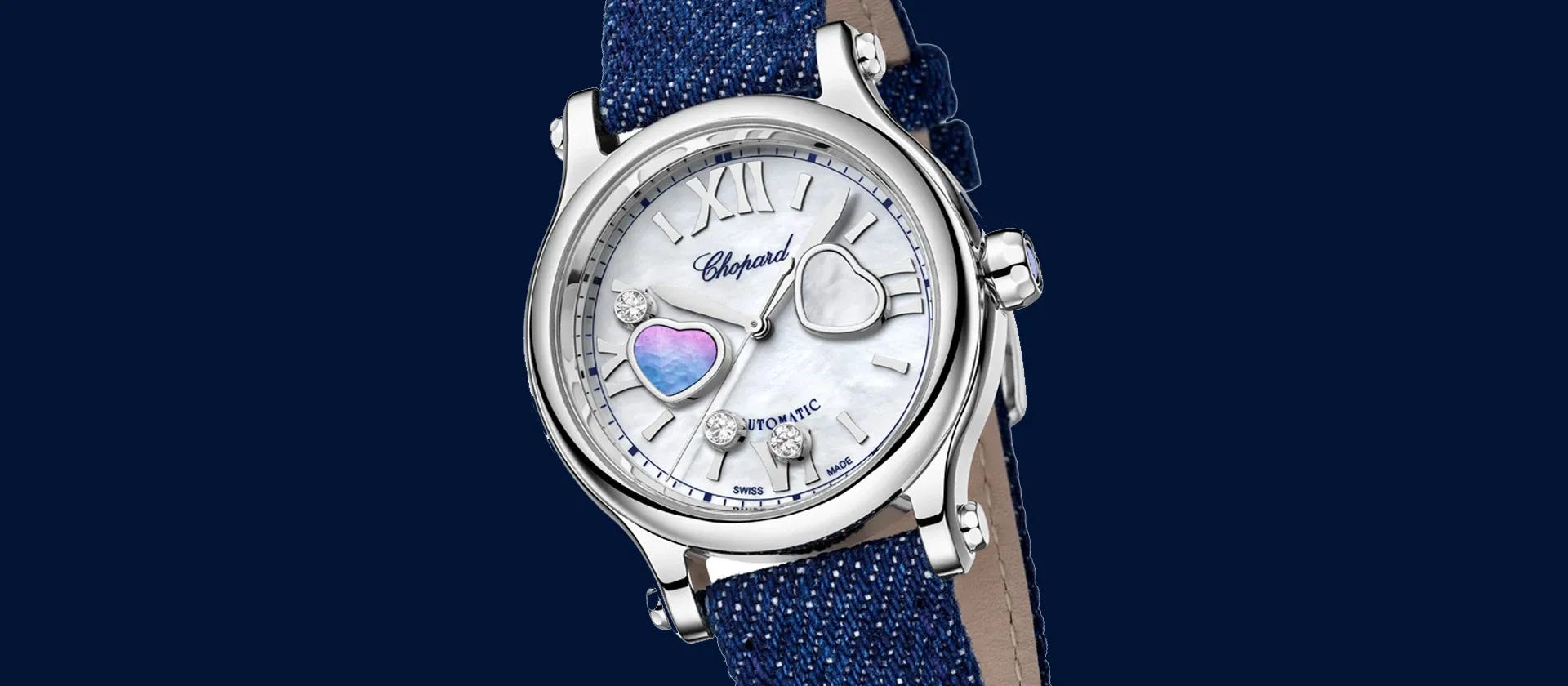 The Happy Hearts 33 mm blends playful dial animation—floating diamonds and mother-of-pearl hearts—with a polished, everyday-wearable luxury look. It uses Chopard’s Lucent Steel (noted as high recycled content) and pairs the jewelry-forward dial with a proper self-winding mechanical movement for legitimacy beyond pure ornament. The denim strap adds a casual twist to the otherwise refined aesthetic, aiming for “daily luxury” rather than special-occasion only. Price is approximately $10,959 (converted from £8,220).