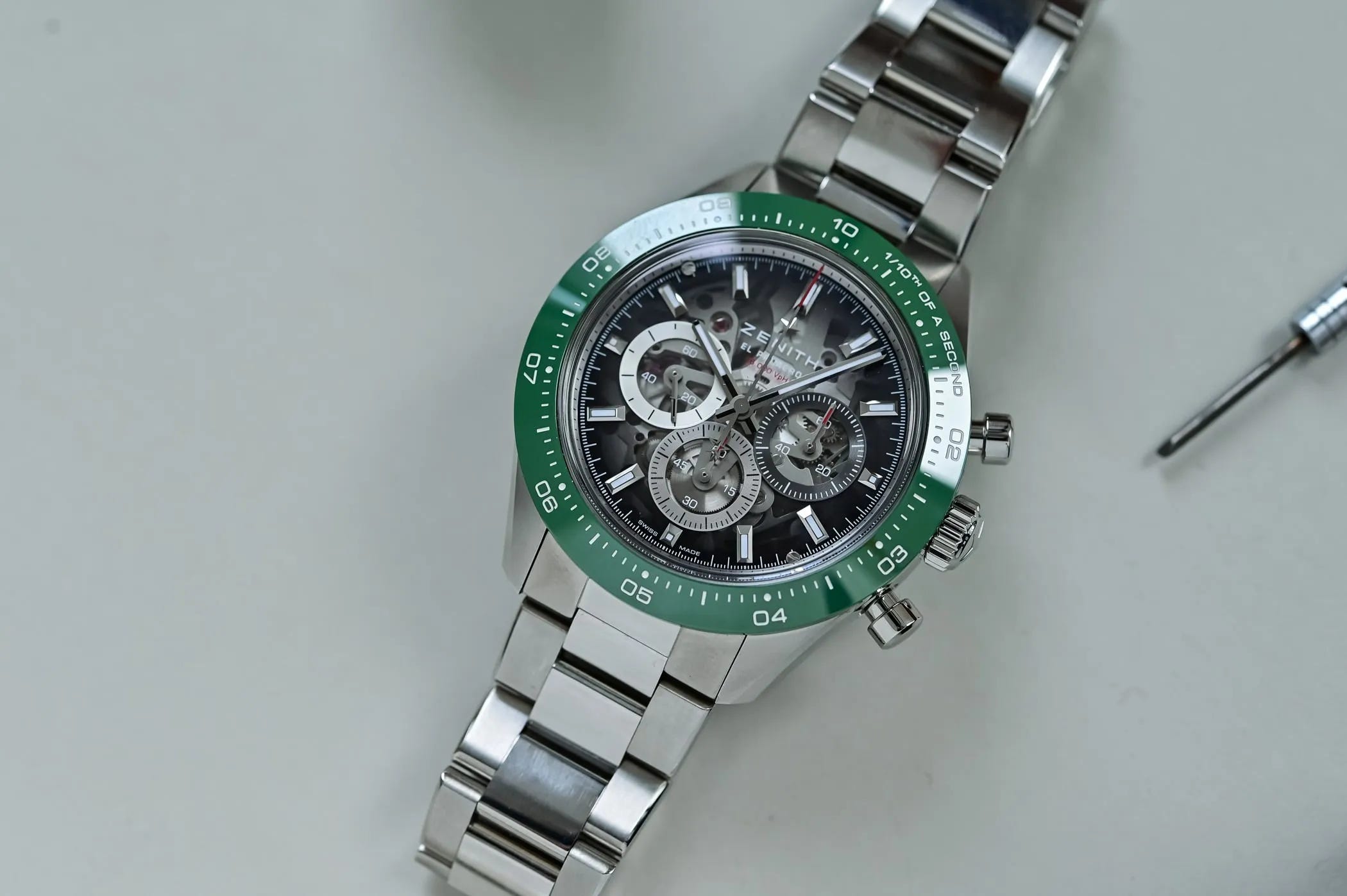 Zenith skeletonizes the Chronomaster Sport to put the El Primero 3600SK on full display, using a tinted sapphire dial that keeps the silhouette modern while exposing the movement’s structure. The story stresses the technical identity—5Hz high-beat timing with 1/10th-second chronograph capability—while positioning the design as more contemporary and mechanical-forward than the standard model. Multiple variants are offered across steel and precious metal, signaling that Zenith sees the skeleton concept as a core collection pillar, not a one-off experiment. Price is approximately $19,323 (from €16,500) up to $130,487 (from €111,400) depending on version.