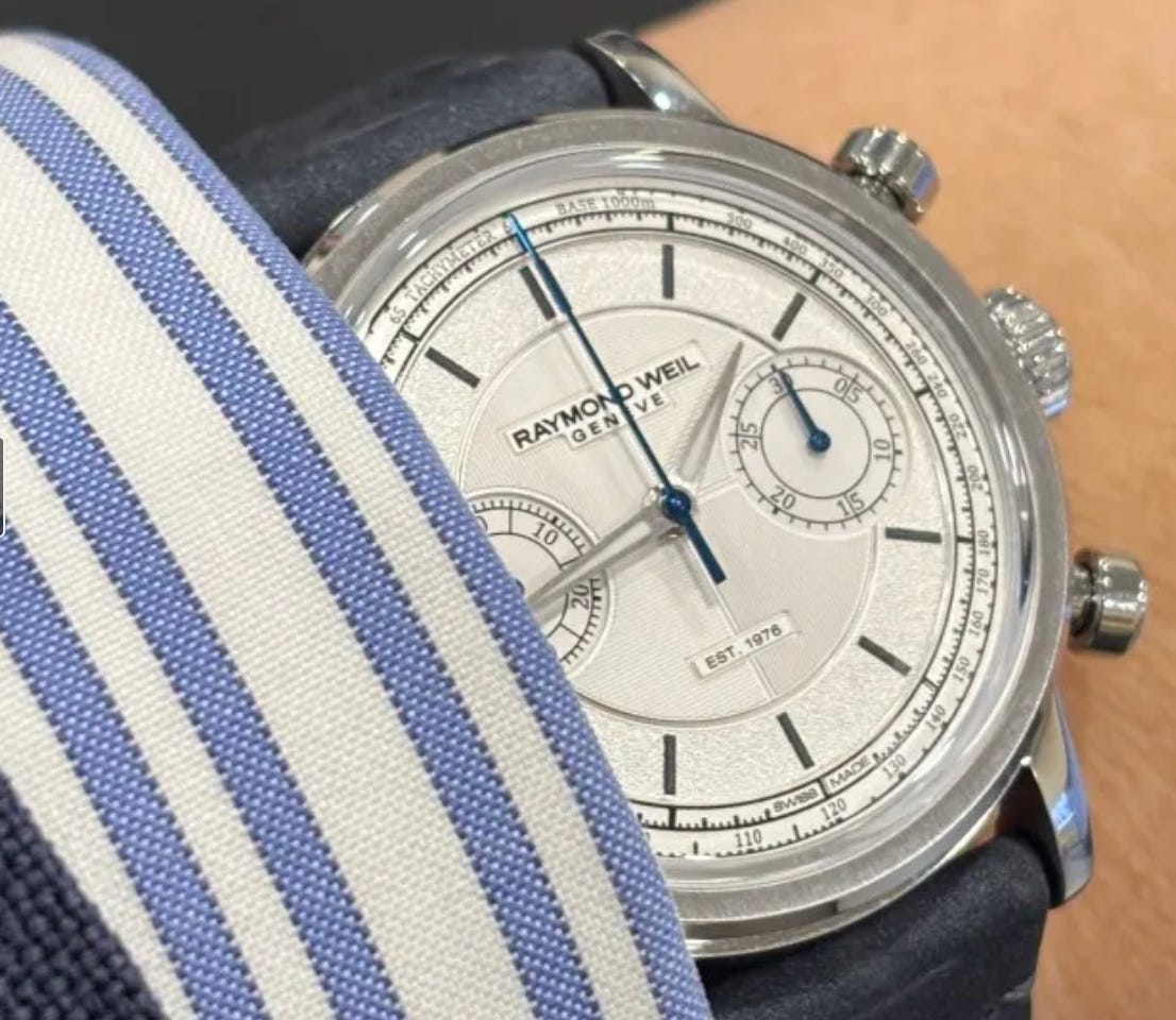 Raymond Weil’s anniversary release leans heavily into heritage, pairing a compact, elegant case with dial details meant to reward close, in-person viewing. The standout story point is the use of a vintage Valjoux 23 movement said to be new old stock from 1976, then refinished and rebuilt for this edition. That choice positions the watch as a collector-leaning celebration of traditional chronograph history rather than a modern “in-house” flex. Price was not provided.