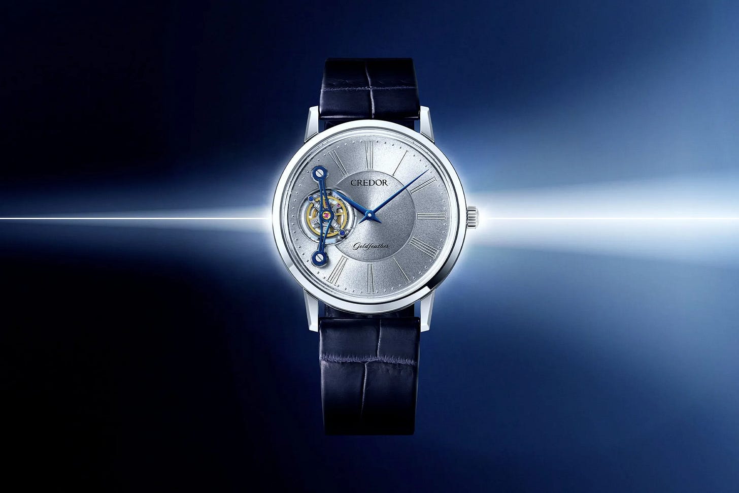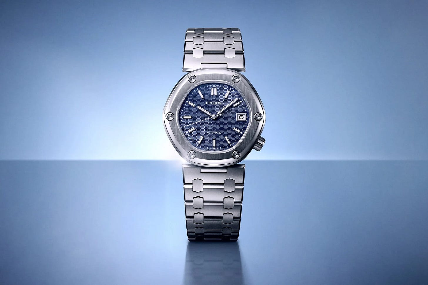 The Dawn Blue Credor Locomotive is a compact luxury sports watch that keeps the Locomotive’s hexagonal design DNA while adding a dial color meant to evoke the early-morning sky. The titanium case is 38.8mm wide and relatively slim, with 100m water resistance and an integrated-bracelet look that nods to the original Gérald Genta sketch from 1978. Inside is Credor’s automatic calibre CR01 with a 45-hour power reserve, keeping the package modern and daily-wear capable. Price is about $12,474 USD (JPY 1,980,000), with release scheduled for June 2026.