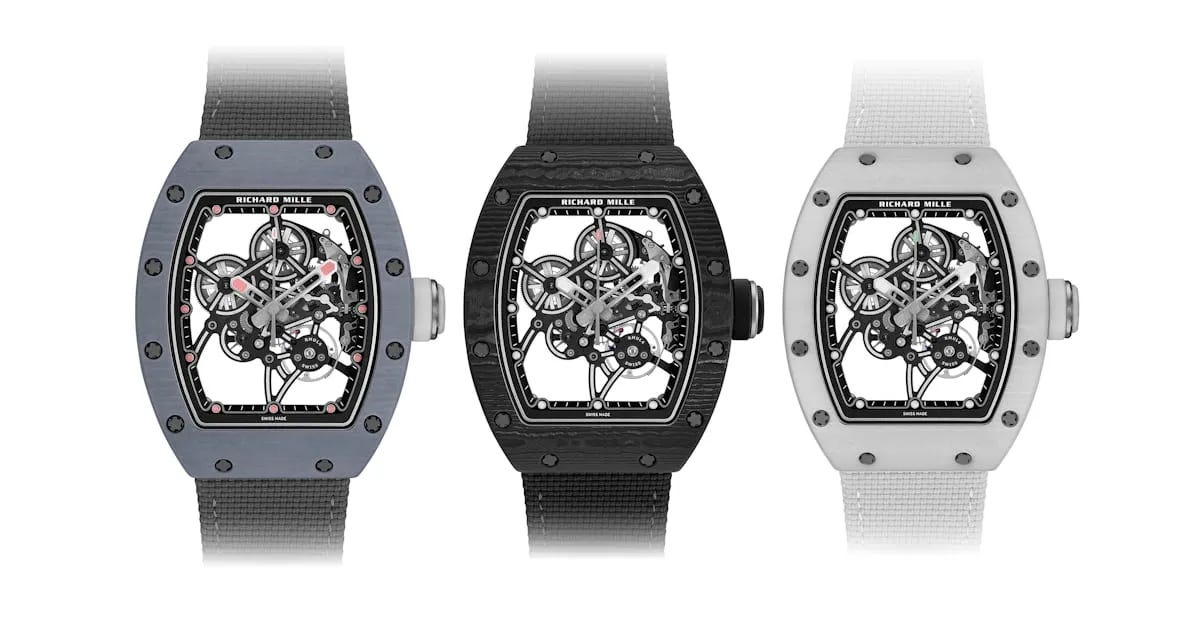 The RM 55-01 returns to a stripped-down, manual-wind formula, pairing a lightweight philosophy with familiar Richard Mille architecture and a three-hand layout. It uses the RMUL4 movement with a 55-hour power reserve and comes in variants built from Carbon TPT, White Quartz TPT, or Grey Quartz TPT, all supported by a distinctive rubber chassis rather than a conventional casing ring. The dimensions (37.95mm wide and 10.75mm thick) keep it comparatively wearable for the brand, with 50m water resistance rounding out the spec sheet. The entry cites an estimated retail price around CHF 155,000, which is approximately $198,307 USD at current rates.