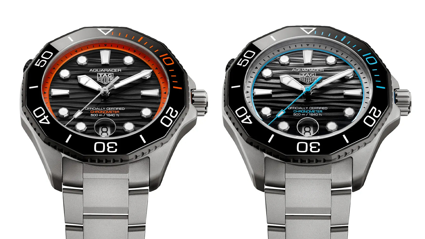 TAG Heuer’s Aquaracer Professional 500 Date targets serious dive capability with a 42mm grade 2 titanium case, a helium escape valve, and 500m water resistance while keeping weight to about 120 grams. Two limited colorways pair a black lacquer dial and ceramic bezel with either vivid blue or orange accents, giving the watch a modern, high-contrast look without sacrificing legibility. Inside is the COSC-certified Calibre TH30-00 with a 70-hour power reserve, and production is capped at 1,500 pieces per color. The database entry does not include pricing information for these models.