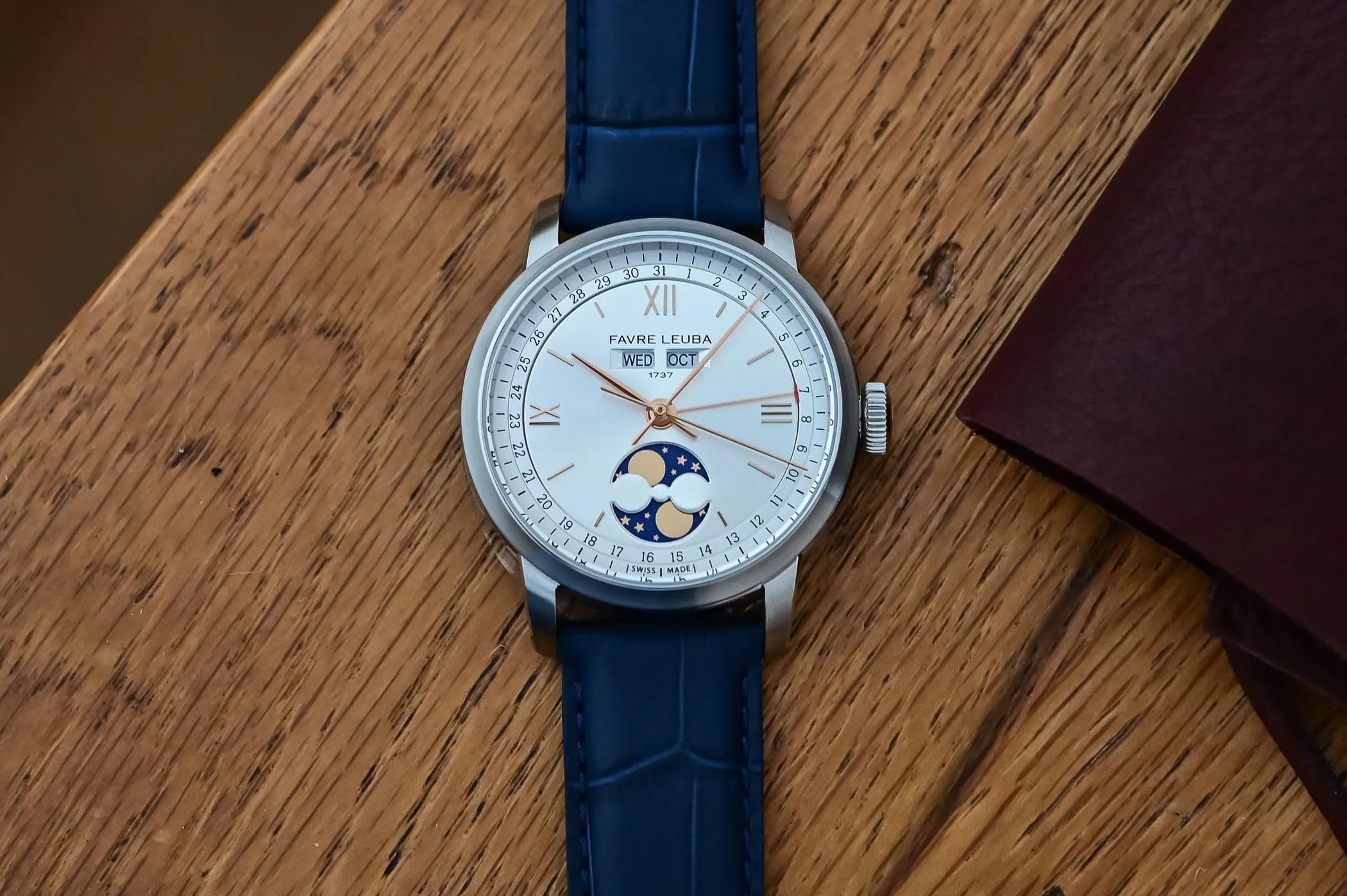 Favre Leuba’s 1737 Triple Calendar uses a modern 39mm steel case (100m water resistance) to reintroduce a classic full-calendar layout with moonphase, framed by a design that nods to mid-century dress-watch proportions. The silver sunray dial pairs gold-toned Roman numerals with twin apertures for day/month and a moonphase complication, balancing heritage with crisp, contemporary finishing. The watch runs on the FLD06 automatic calibre with a 56-hour power reserve and visible decorative work. Price is listed at CHF 3,500, which is approximately $4,476 USD at current rates, putting it in a competitive sweet spot for a traditional complication with modern durability.