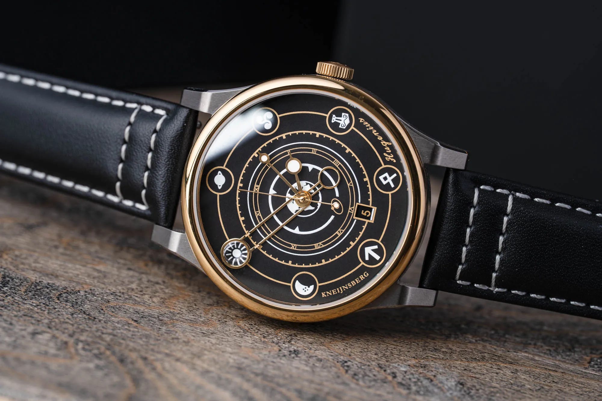 The Kneijnsberg Hugenius is designed as a tribute to Christiaan Huygens and the balance spring, blending modern materials with historical references throughout the watch. A grade 5 titanium case and gold-anodized bezel frame a matte-black dial filled with nods to Huygens’ work in horology and planetary science, though the dense layout can make legibility challenging at times. It runs on a modified ETA 2834-2 and adds a distinctive day-display mechanism that reinforces the watch’s quirky, concept-driven character. With pricing starting at €1,150, it’s aimed at enthusiasts who value narrative, design personality, and off-the-beaten-path brands.