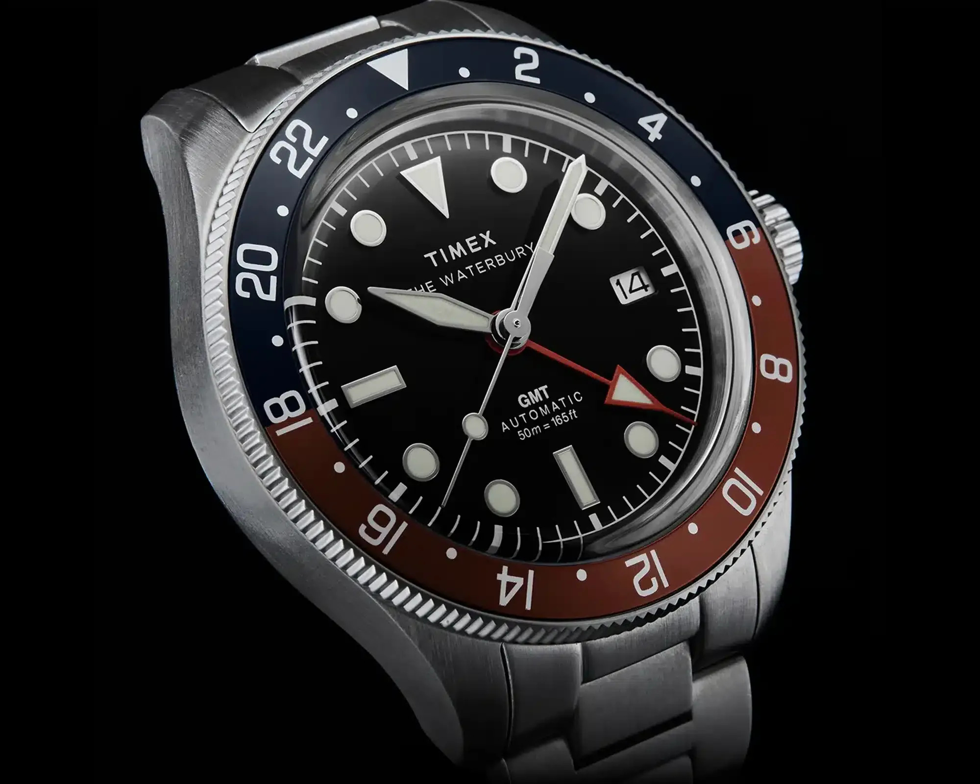 Timex’s Waterbury Heritage Automatic GMT is a deliberate swing at classic GMT aesthetics, offering “Coke” and “Sprite”-style bezel colorways at an entry-level mechanical price. It’s notable as the first mechanical movement in the Waterbury line, using the Seiko NH34A automatic GMT calibre alongside a date window and exhibition caseback. Design cues—applied indices, bold numerals, and a bracelet profile that echoes more expensive icons—do much of the heavy lifting for appeal. Price is listed at $569 USD, making it a low-barrier way to get into a mechanical GMT look, even if the 50m water resistance is a clear compromise.