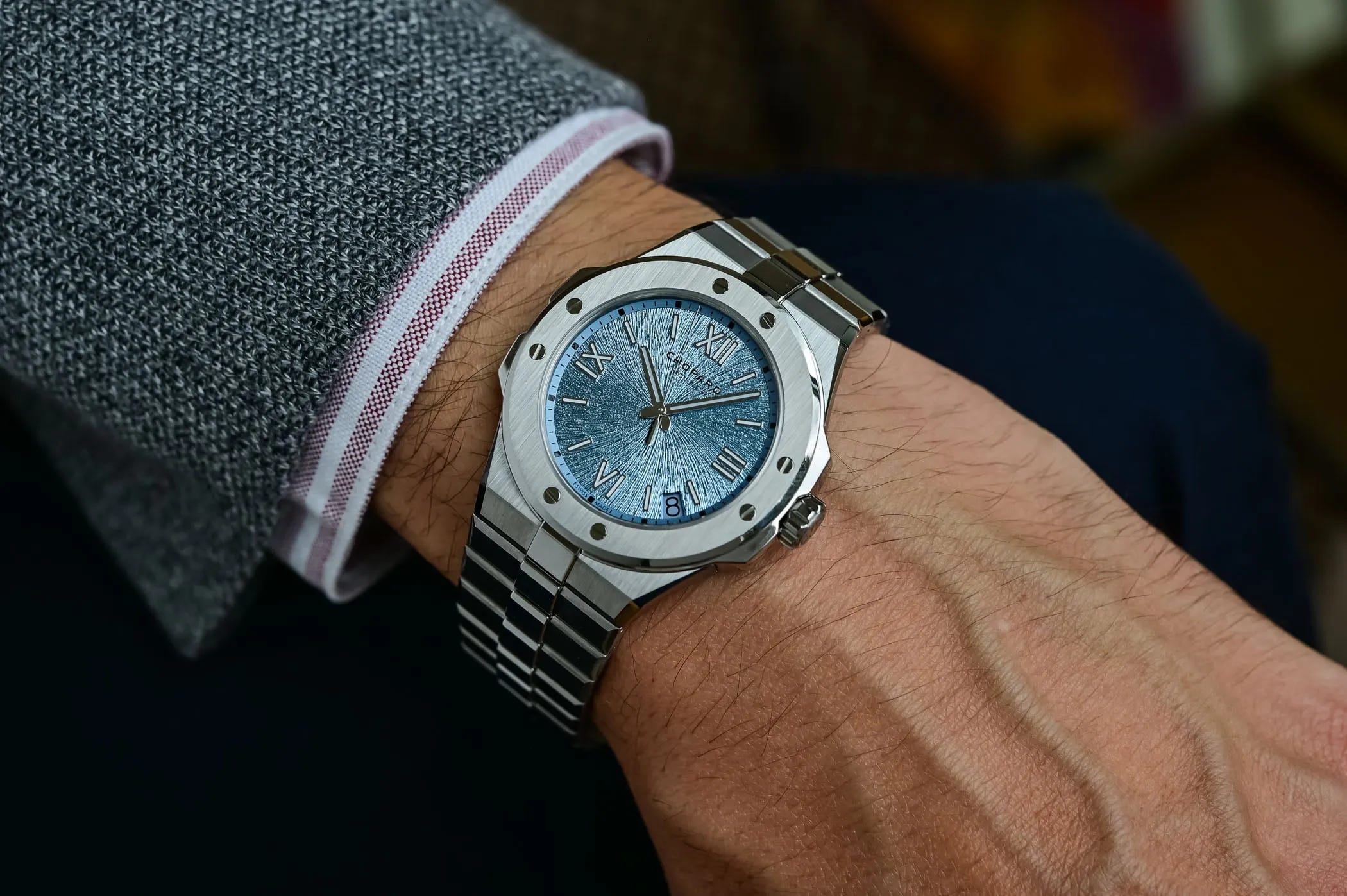 Chopard adds a “Rhone Blue” dial to the Alpine Eagle in both 41mm and 36mm, using its Lucent Steel case and integrated-bracelet architecture to keep the collection’s upscale-sport identity intact. Both versions are COSC-certified automatics, with the 41mm adding a date while keeping the familiar fluted bezel held by eight screws. Pricing is listed as CHF 12,400 (36mm) and CHF 15,400 (41mm), which converts to approximately $15,857 USD and $19,697 USD respectively at current rates. A portion of proceeds supports the Alpine Eagle Foundation, tying the launch to the brand’s ongoing environmental initiative.