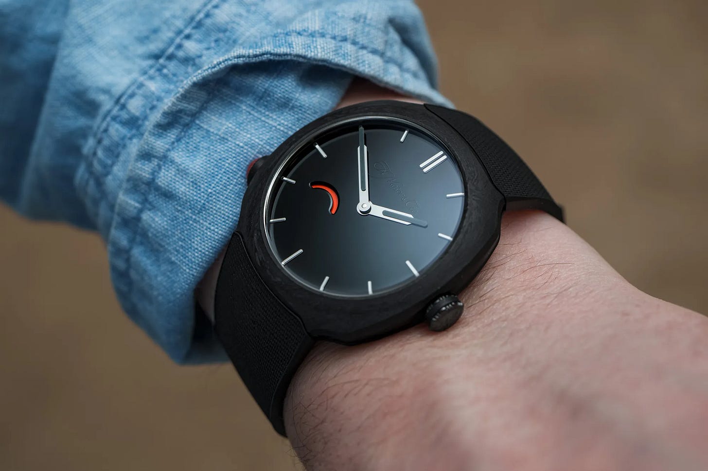 This collaboration reimagines the Reebok Pump concept as a functional winding system, replacing a traditional crown with a pusher that adds power to the mainspring and feeds a dedicated reserve indicator. The 40mm case uses forged quartz fiber with a titanium core, pairing lightweight toughness with a playful, retro-sporty identity and 100m water resistance. Inside is the hand-wound HMC 103 movement, engineered for a long reserve and modern finishing visible through the back. The piece is framed as nostalgia done seriously—high-end mechanics with an interactive twist rather than a pure gimmick.