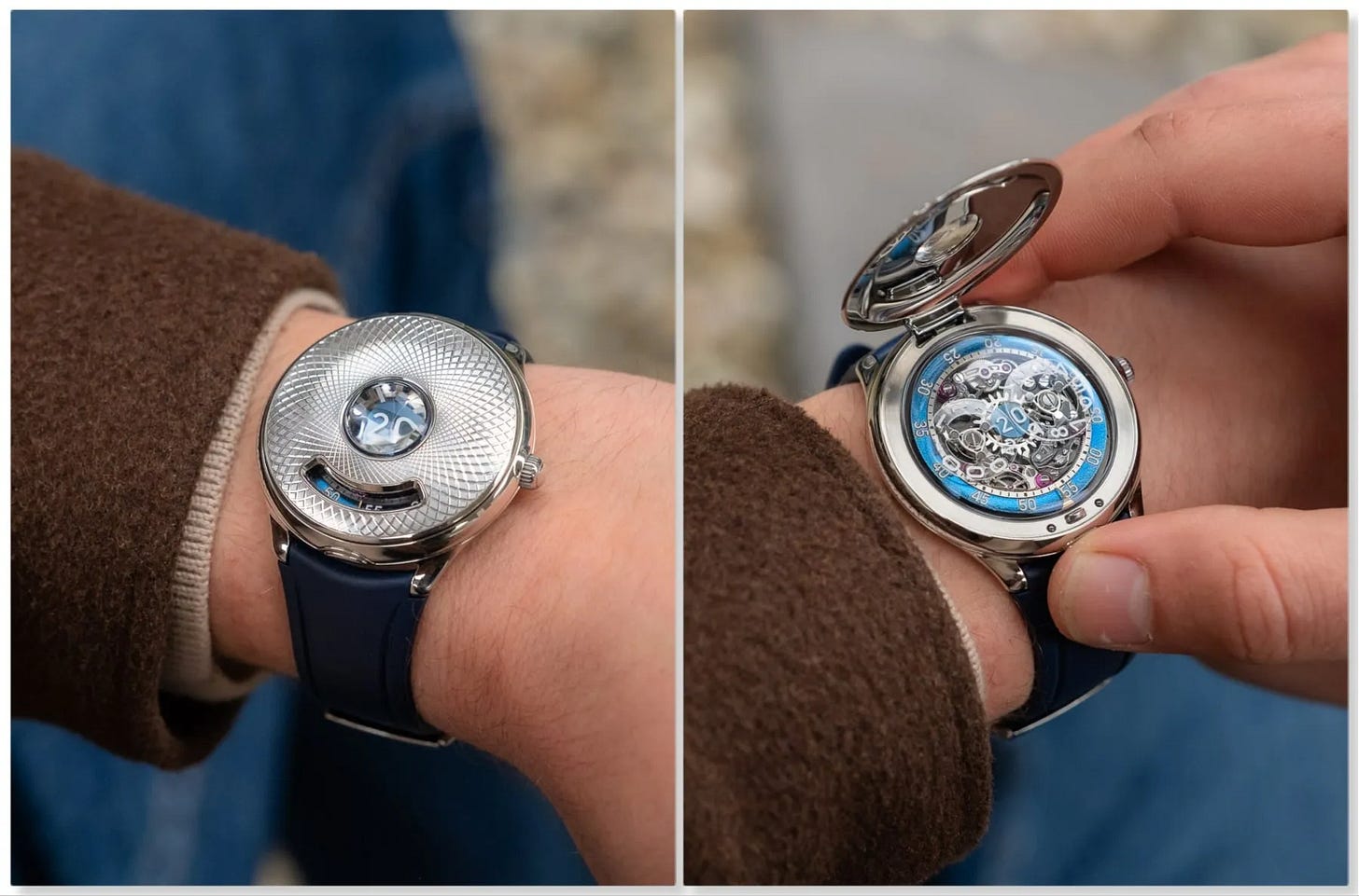 Czapek’s Time Jumper is described as a futuristic 40.5mm steel half-hunter watch that hides its jumping-hour display beneath a hinged cover. Time is shown through sapphire discs for the jump hour, with minutes tracked around the edge, blending tactile interaction with a very modern presentation. The case and guilloché detailing are used to create depth and optical illusion, while the in-house calibre 10.01 provides an open-worked architecture and a platinum rotor.