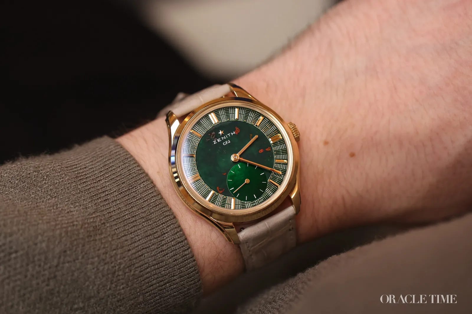 Zenith’s G.F.J. Bloodstone edition is framed as a limited-run 39mm yellow-gold chronometer that pairs a dark green bloodstone dial with high-end detailing like a mother-of-pearl seconds counter and gold hands. The re-engineered hand-wound Calibre 135 is central to the appeal, delivering a long power reserve and modern upgrades like stop-seconds while referencing the historic prize-winning architecture. Beyond the stone-dial trend, the watch is positioned as a blend of heritage, strong proportions, and modern finishing meant to compete at the top end of contemporary luxury releases.