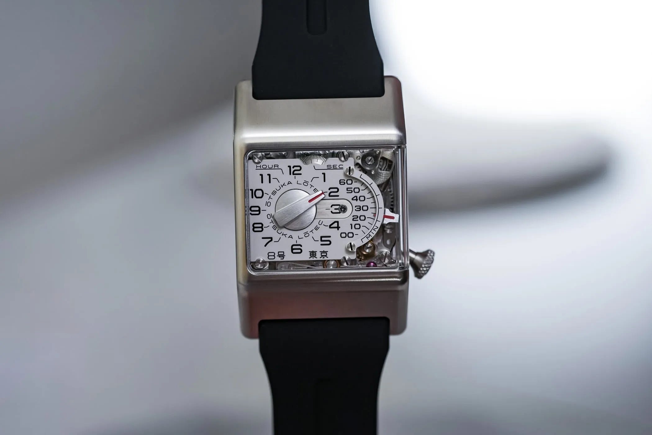 Otsuka Lotec’s No. 8 doubles down on Jiro Katayama’s industrial-design approach, using a rectangular steel case and a “control panel” display that prioritizes mechanical theater over conventional readability. The time is shown through jumping hours and a retrograde minute indication, with additional motion elements like a flywheel and running seconds bringing the dial to life. Underneath is a Miyota automatic base augmented by an in-house module, creating a complex, kinetic display with a relatively short power reserve that fits the concept’s mechanical focus. Distribution is tightly limited and region-specific, reinforcing its cult status among collectors drawn to design-forward independent watchmaking.