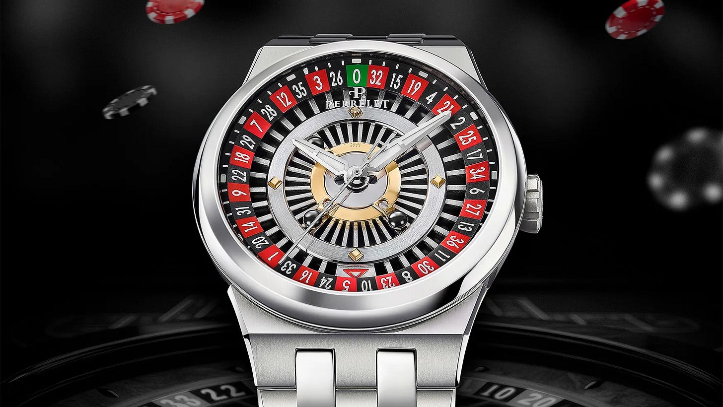 Perrelet’s Turbine Casino Roulette turns the brand’s turbine-dial concept into a playful roulette display, with a spinning red arrow that “selects” numbers 0–36 as the rotor animates with wrist motion. The watch is housed in a 41mm grade-2 titanium case and keeps conventional time via centrally mounted hands treated with Super-LumiNova. It runs on the in-house P-331-MH automatic movement with a 42-hour power reserve, and it’s both COSC- and Chronofiable-certified. Limited to 100 pieces, the price is €5,250, which converts to approximately $6,150 USD (at ~1 EUR = $1.17).