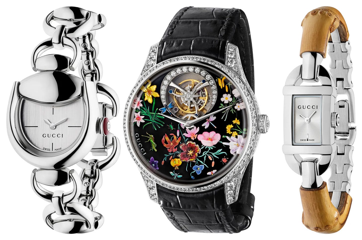 Gucci is pivoting toward women’s watches in 2026, introducing designs that emphasize the brand’s signature fashion motifs in smaller, elegant formats. New releases include the Horsebit collection with polished-steel two-hand models that integrate the horsebit detail into the case, alongside bamboo-inspired rectangular pieces that reference Gucci’s iconic accessories. The lineup leans heavily on quartz for accessible pricing, while the high-end G-Timeless Métiers d’Art pieces elevate the approach with enamel dials, diamond embellishment, and exposed tourbillons. Overall, the releases signal a more intentional strategy to pair Gucci’s craft and visual codes with watchmaking aimed squarely at a women’s audience.