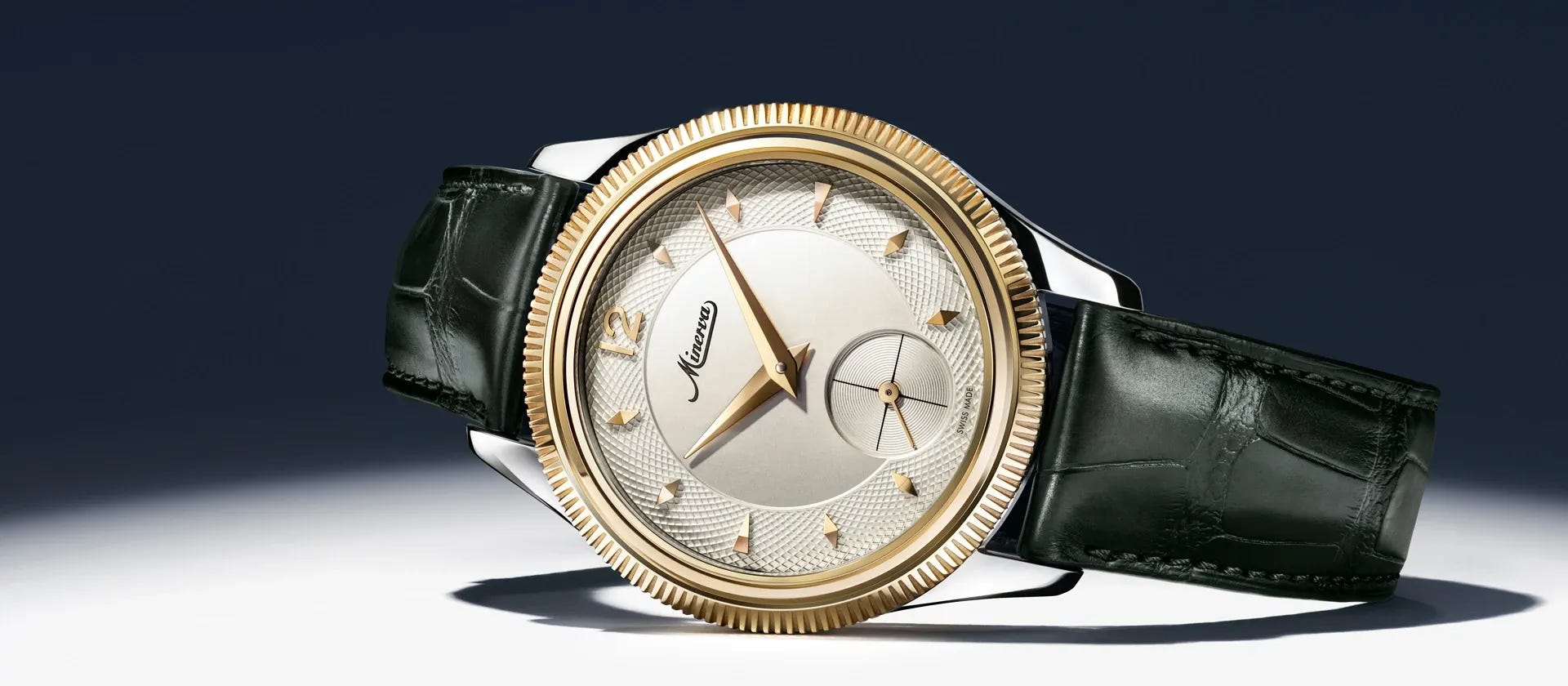 Minerva’s Unveiled Crownless replaces the traditional crown with a bezel-operated winding/setting system, aiming for a cleaner, perfectly symmetrical case profile while making interaction more tactile. The watch pairs a 41.5 mm stainless-steel case with an 18 ct rose-gold fluted bezel and a manually wound Calibre M15.08 movement offering an 80-hour power reserve. Visually, it blends historic Minerva cues with contemporary refinement, and the exhibition back emphasizes movement architecture and finishing as a central part of the experience. The write-up frames it as a modern mechanical re-think that still leans heavily on Minerva’s heritage narrative and presentation.