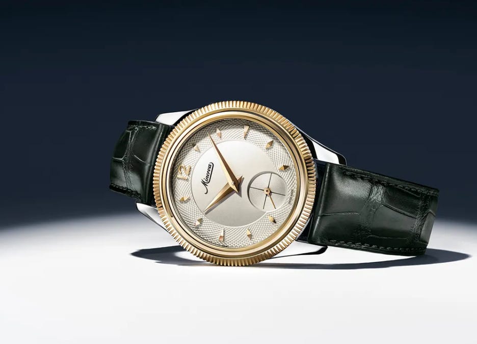 Minerva’s “The Unveiled Crownless” eliminates the traditional crown by shifting all operation to the bezel, which winds the watch and sets the time via a concealed lever mechanism. The watch pairs this unusual functionality with a refined, heritage-leaning dial layout (including a guilloché chapter ring and a subsidiary seconds) inside a two-tone steel-and-gold case. Power comes from the in-house, manually wound Calibre M15.08 with an 80-hour power reserve, giving the concept real mechanical substance. Price is $38,000.