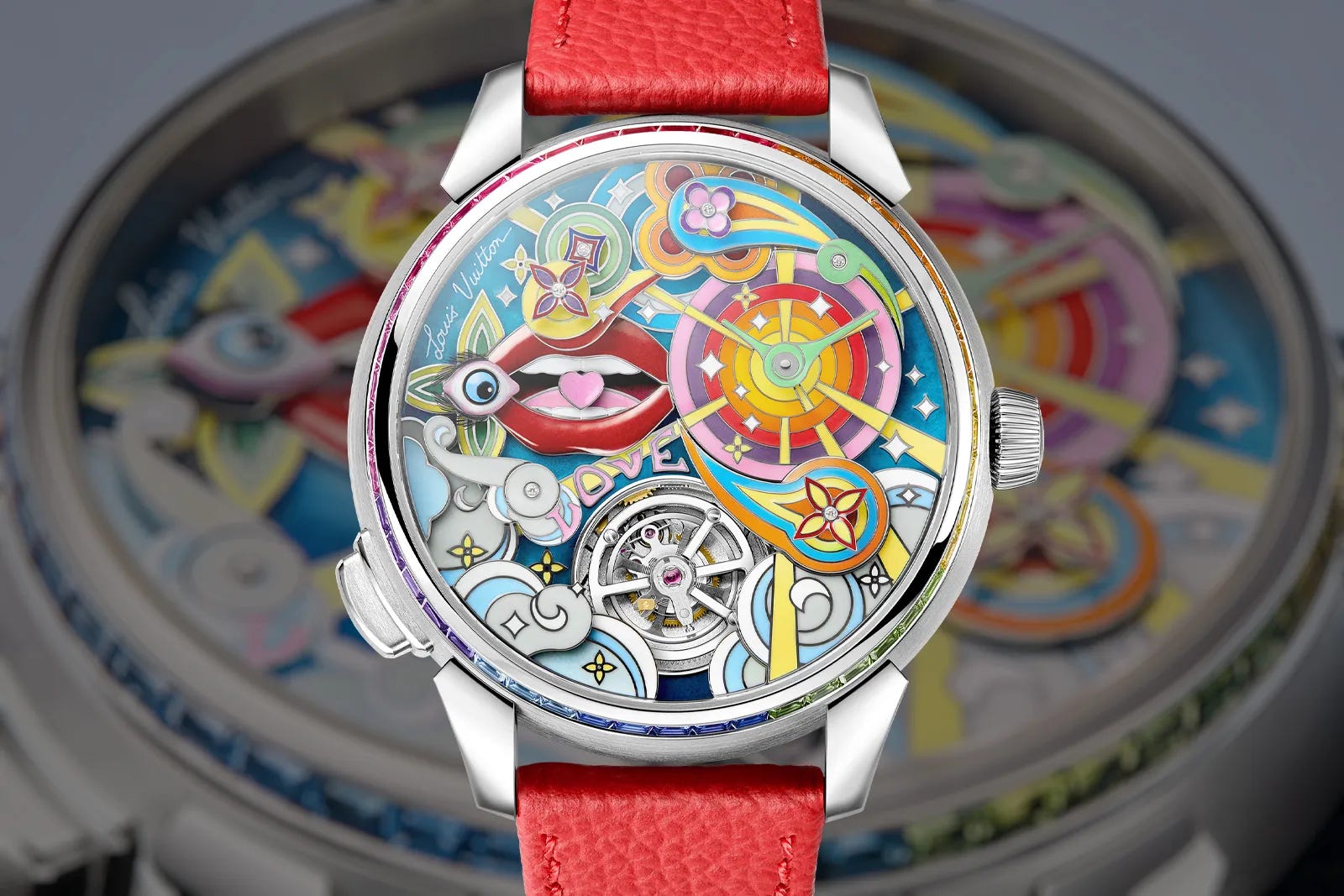 Louis Vuitton’s Tambour Taiko Arty Automata combines a flying tourbillon with animated dial theatrics—like spinning hearts and a swiveling eyeball—executed through extensive métiers d’art handwork. The multi-layer enamel dial reportedly uses 23 enamel shades and requires over 250 hours of craft, while the bezel intensifies the spectacle with baguette-cut sapphires and rubies. The automatic LFT AU05.01 movement delivers a 65-hour power reserve, pairing high-mechanics with high-decoration in a tightly controlled boutique-only release. Price converts to about $564,000.