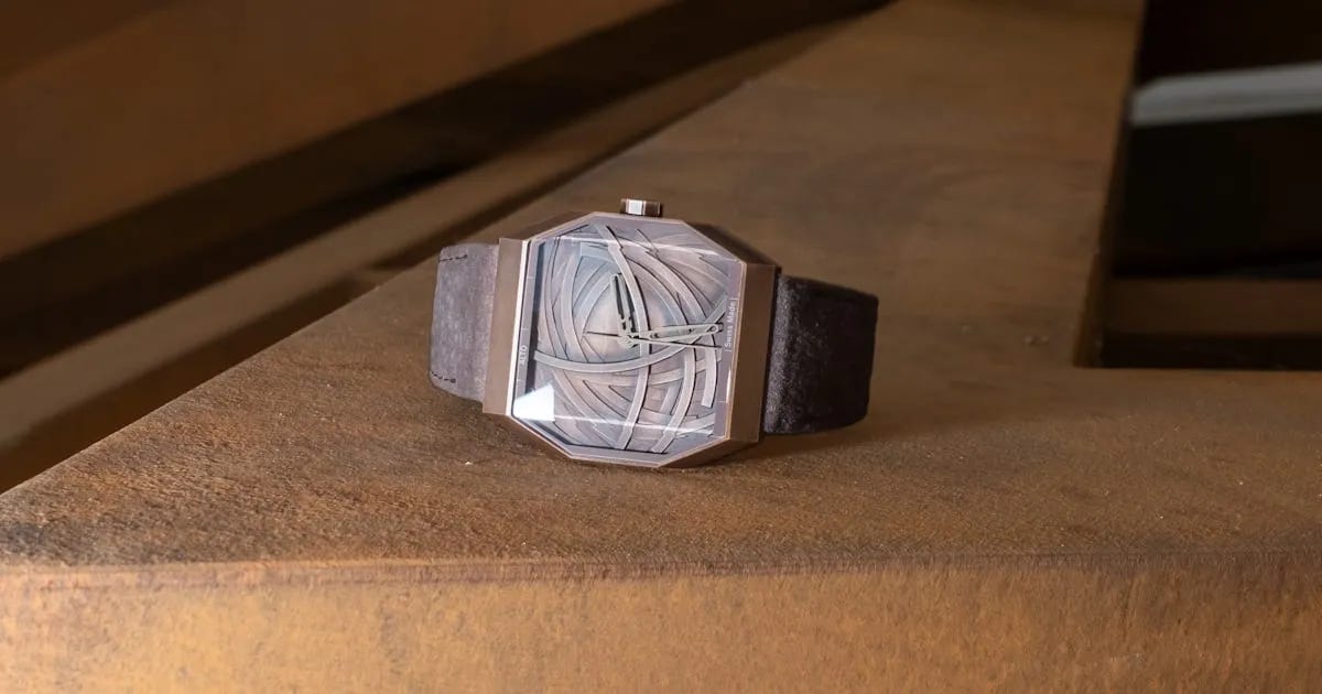 Alto’s Art 01 Bernar Venet is a limited-edition collaboration with French artist Bernar Venet, built around a bronze alloy case designed to evolve its color and patina over time. The sculptural dial uses bending arcs and topographical depth to create shifting light-and-shadow effects, making the watch feel as much like an object as a timekeeper. Mechanically, it’s powered by a micro-rotor movement running at 4Hz with a 48-hour power reserve, and it adds a deliberately provocative touch with a backwards-running seconds hand. Pricing wasn’t disclosed in the story, though it’s expected to come in above Alto’s prior models.