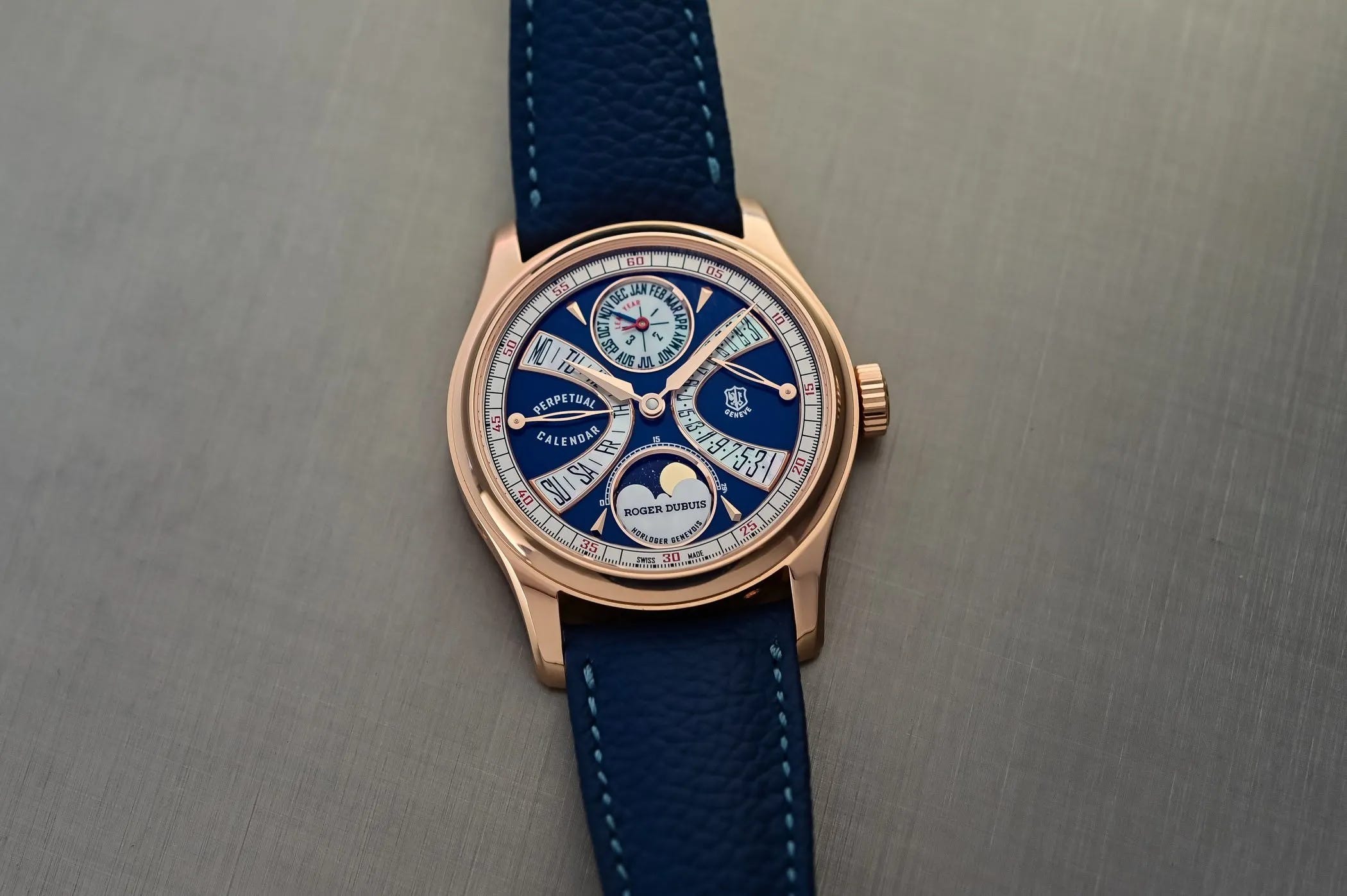 The Hommage La Placide re-centers Roger Dubuis on classic high watchmaking with a 38 mm pink gold case and double-retrograde perpetual calendar. It uses the brand’s first in-house automatic movement and a layered blue dial inspired by Lake Geneva with mother-of-pearl calendar accents. Limited to 28 pieces at EUR 115,000 before taxes, it signals a return to refined elegance. The release honors the maison’s origins while hinting at future heritage-leaning collections.