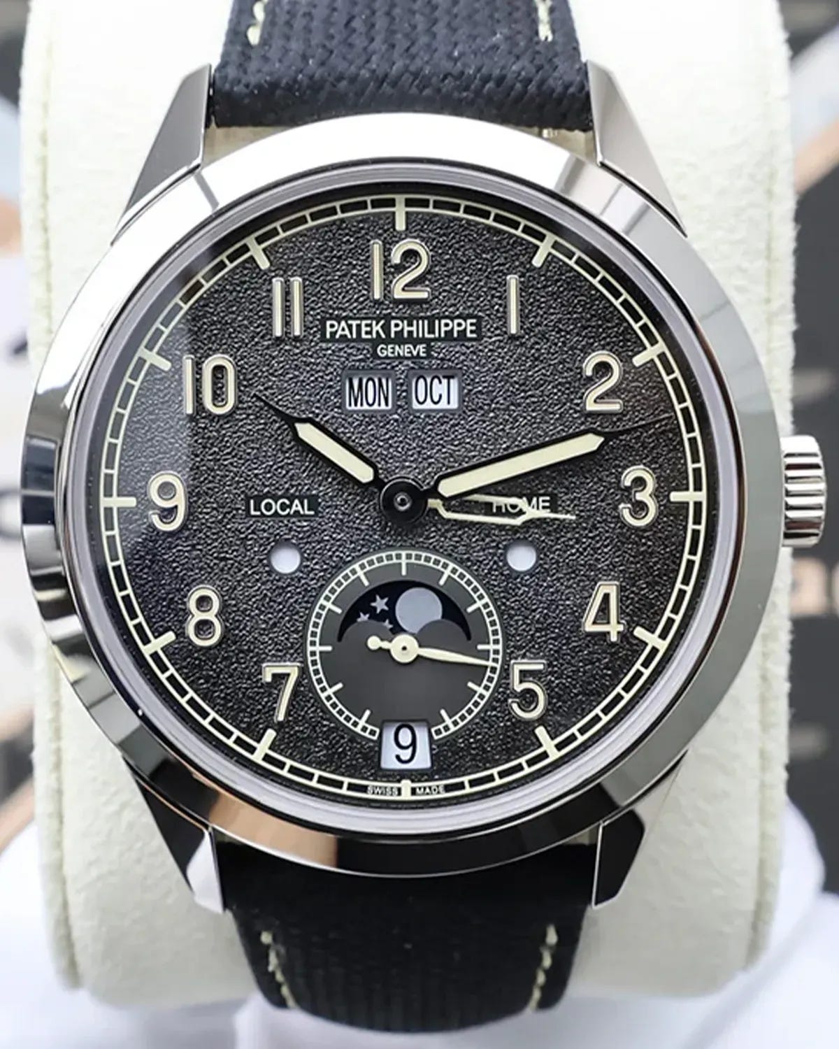 Visually, this reference has become something of a modern cult favorite. The 41mm white gold Calatrava-style case is ringed by a guilloché hobnail pattern around the caseband—a nod to classic Patek dress pieces—but the watch is anything but stuffy. The charcoal grey dial has a granular, textured surface inspired by vintage camera cases, giving it a slightly “field watch” attitude, especially when paired with the syringe hands and Arabic numerals. The textile-style strap on this example fits that aesthetic perfectly, walking the line between casual and refined; many sets also ship with a second strap option, which only adds to its travel-ready flexibility.