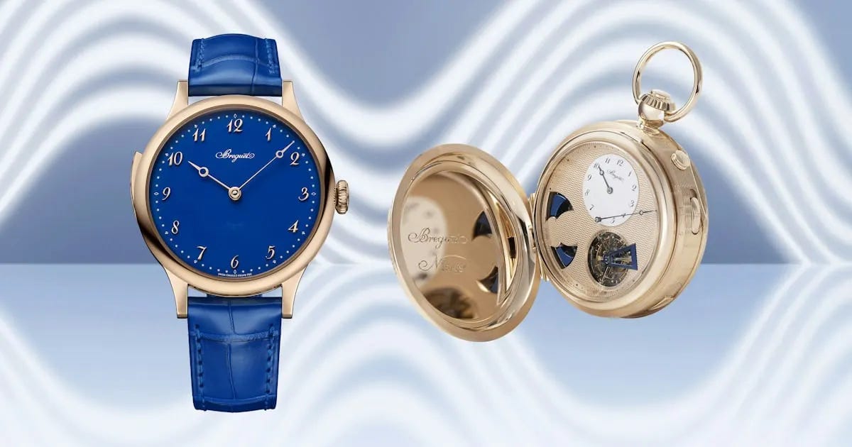 Breguet marks its 250th anniversary with the Ref. 7365 Minute Repeater in 18k “Breguet gold,” a 39.1 mm wristwatch with a blue grand feu enamel dial. It debuts the manual-wind caliber 1896 with 75-hour power reserve and regulation within ±2 seconds per day. The Classique Grande Sonnerie pocket watch pairs a minute repeater with a one-minute tourbillon and a magnetic regulator for precise chime timing. The wristwatch is limited to 25 pieces at $369,600, while the pocket watch is price on request.