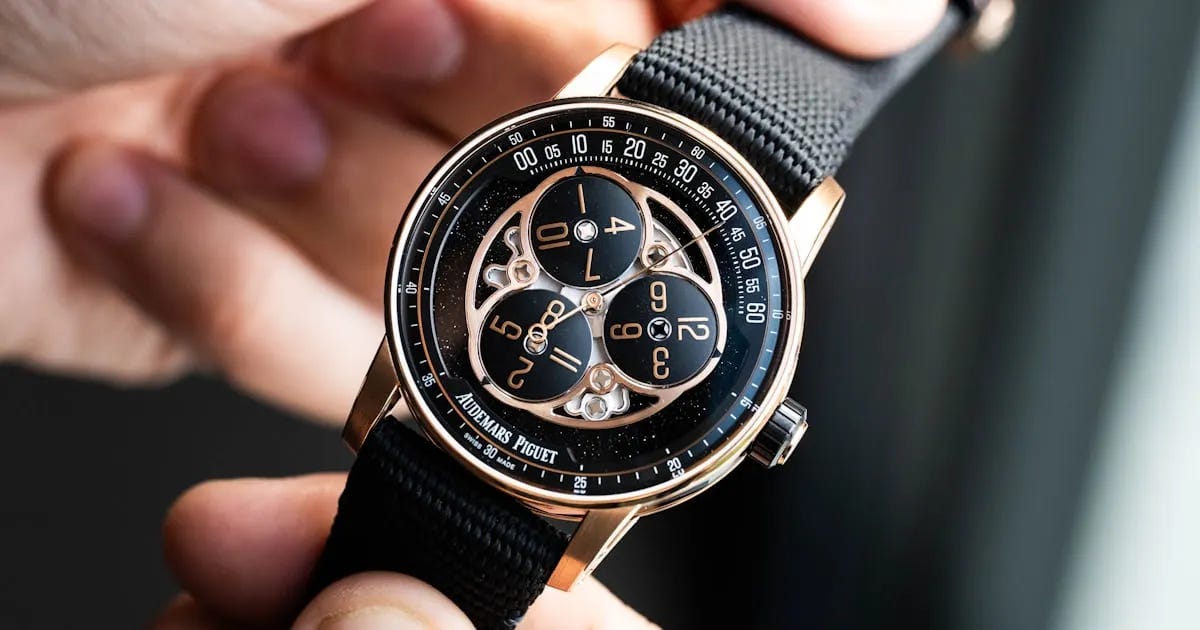 A rose gold take on the wandering hours complication adds warmth and three-dimensionality to the rotating hour discs over black aventurine. The 41 mm case houses a modern in-house calibre with 70 hours of power reserve, blending industrial sharpness with refined finishing. Demand remains high even at $62,600, complementing rather than replacing the white gold version. It’s a contemporary showcase of craft rooted in AP’s heritage of innovation.