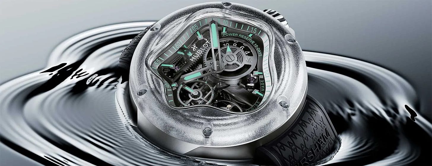 Hublot’s MP‑17 MECA‑10 Arsham Splash frames the idea of a water droplet frozen in time, integrating a 10‑day MECA‑10 caliber into a lightweight titanium and frosted‑sapphire case. A splash‑shaped aperture replaces a traditional dial, emphasizing the fluidity and cyclical nature of time in Arsham’s work. Limited to 99 pieces, it functions as both timekeeper and sculptural statement. The collaboration underscores Hublot’s “Art of Fusion” at the intersection of contemporary art and high horology.