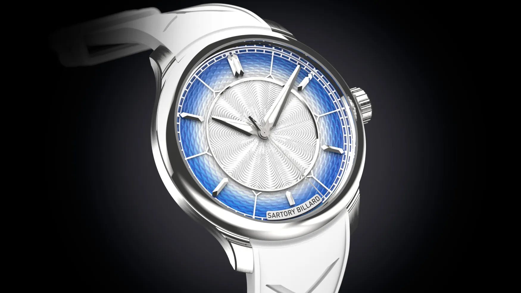 A 25‑piece collaboration with Exquisite Timepieces, the SB04‑E’s gradient blue guilloché dial shifts from navy to pale sky, framed by a 39.5mm steel case. The sapphire chapter ring, diamond‑cut indices, and lumed hands add crisp legibility and depth, while 100m water resistance keeps it versatile. Power comes from the La Joux‑Perret G101ET with a 68‑hour reserve, and both a white rubber strap and steel bracelet are included. Price: $6,400.