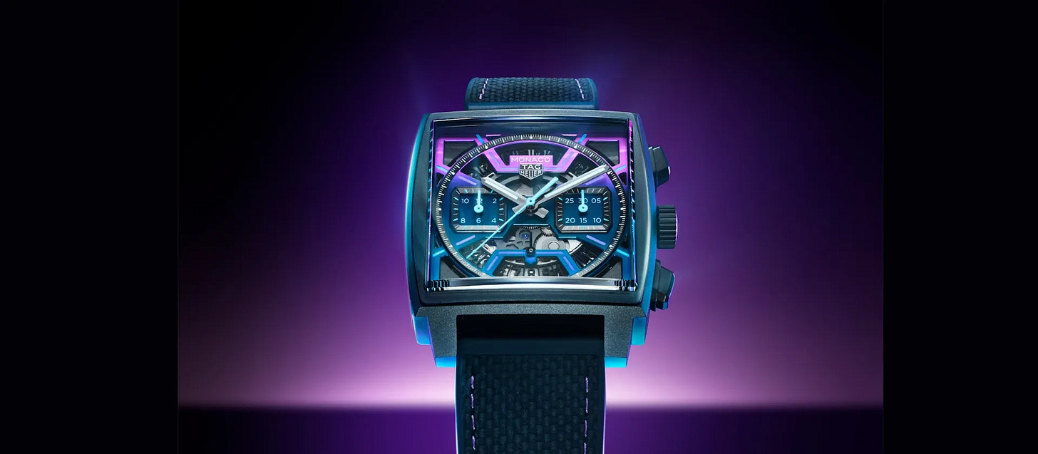 This limited Monaco celebrates Formula One spectacle with a Grade 2 titanium square case in black DLC and a skeleton dial that fades from purple to dark blue. Turquoise subdials, 100 m water resistance, and strong lume give it presence day and night. The in‑house TH20‑00 automatic delivers an 80‑hour reserve beneath an exhibition back with a gradient metallization. Limited to 600 pieces, it blends racing drama, luxury finishing, and daily practicality.