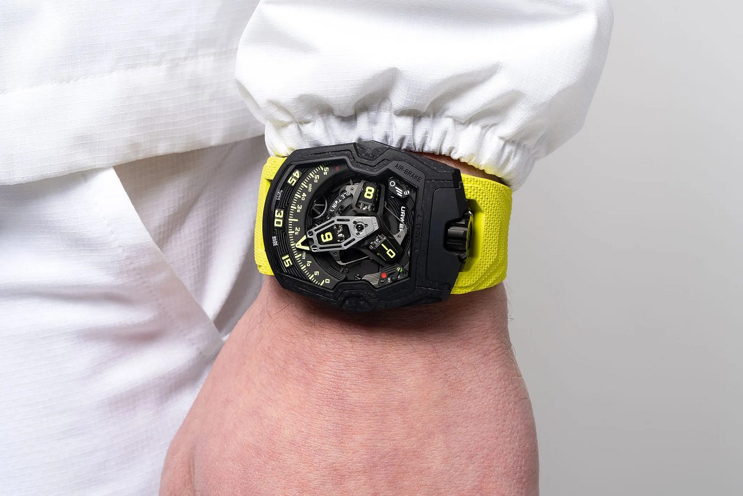 Closing the UR‑230 series, the Black Star Edition blends stealthy black and vivid yellow in a laminated composite‑ceramic case measuring 44.81 × 53.55 mm. A satellite wandering‑hours display meets a retrograde 3D hand and self‑winding movement with twin turbine regulation. Limited to 35 pieces with a 50‑hour power reserve and yellow vulcanized rubber strap, it teases new adventures ahead in 2026. Price: CHF 150,000.