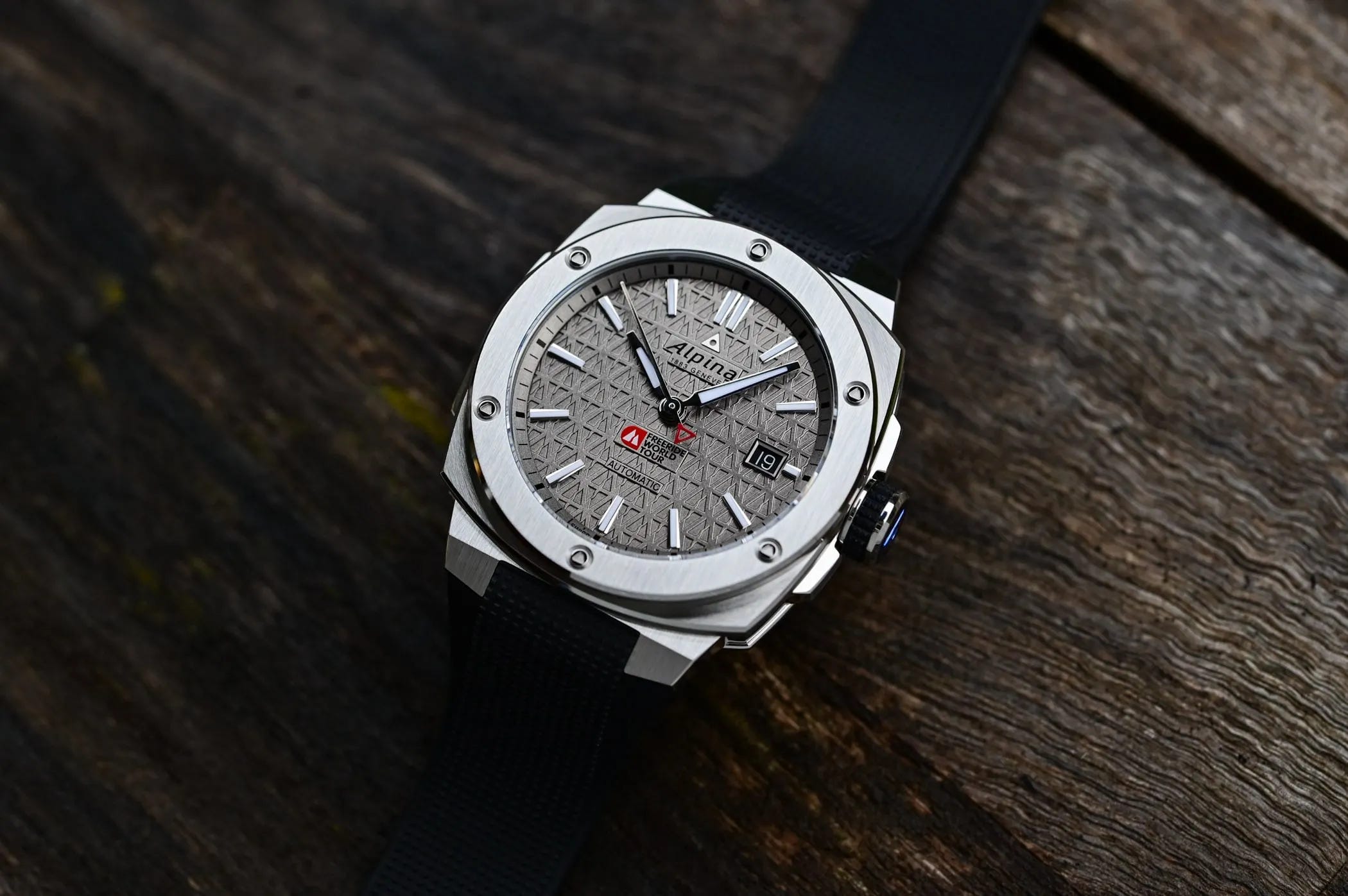 Celebrating its ninth year with the Freeride World Tour, Alpina’s 39 × 40.5 mm cushion‑case model arrives in a monochrome grey inspired by alpine rock. It brings the FWT emblem to the dial for the first time, alongside excellent legibility and a practical date display. Powered by the AL‑525 automatic calibre, it offers a 38‑hour power reserve and 200 m water resistance on a cold‑resistant rubber strap with deployant clasp. Price: EUR 1,695.