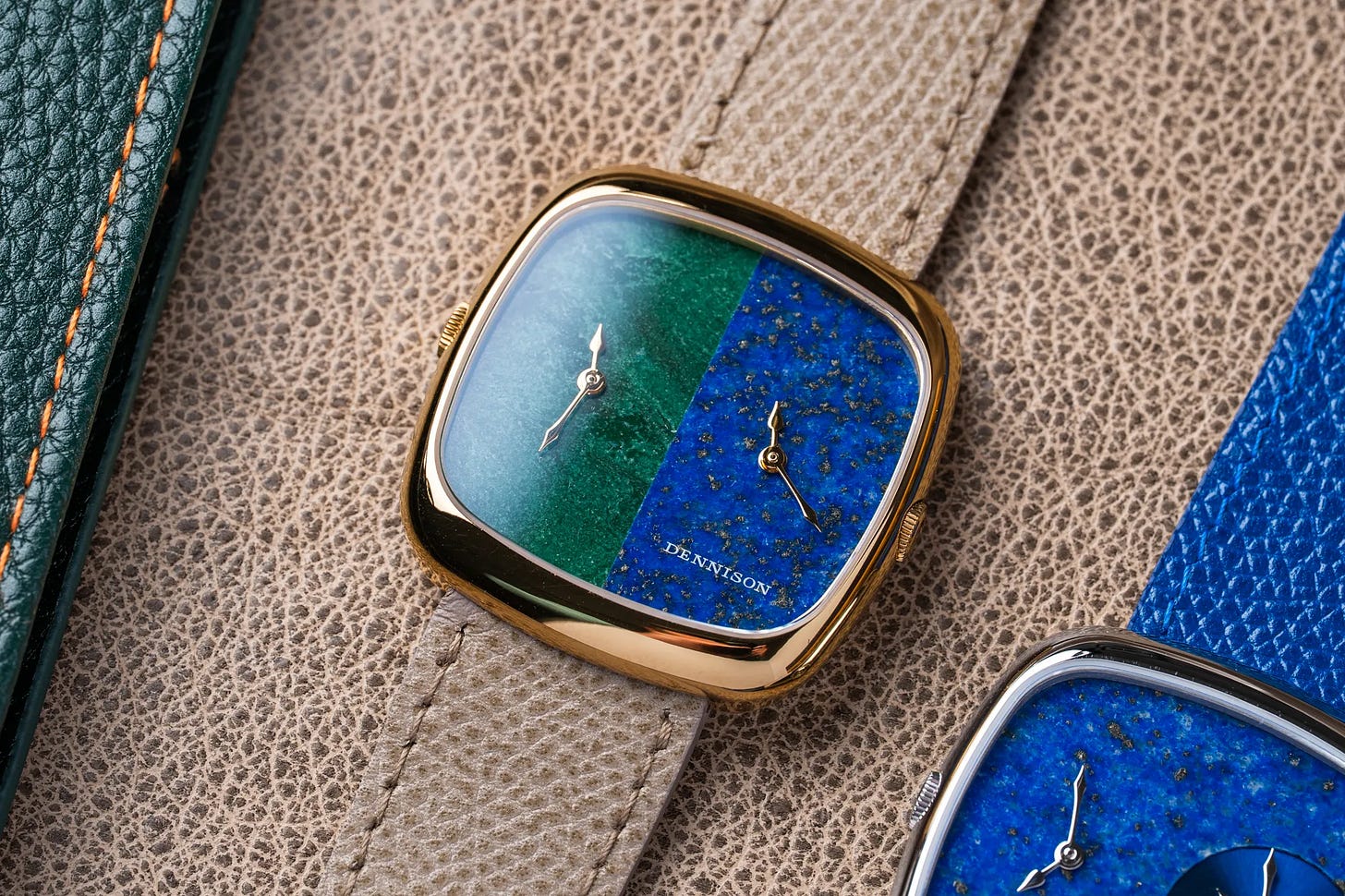The Dennison ALD Dual Time refines the dress‑watch formula with a wider cushion‑style case and dual‑time display, offered with striking stone dials like bloodstone and lapis lazuli. A reliable Swiss quartz movement keeps things precise and low‑maintenance, ideal for formal and daily wear. The minimalist execution lets the textures and colors do the talking while maintaining strong wrist presence. Price: $890 USD.
