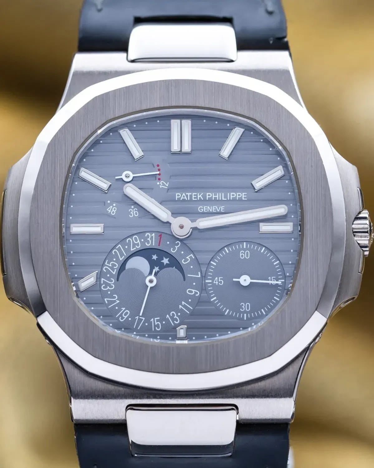 The example on the block comes with inner and outer boxes, additional items, and papers dated 2012, which puts it in the earlier half of the production run and gives it over a decade of quiet provenance. The seller represents it as being in very good condition, which, paired with a full set, is exactly the recipe the market favors for complicated Nautilus pieces. The asymmetrical layout remains the star: the power reserve arcing between 10 and 11 o’clock, the moon-phase/date display at 7, and the small seconds at 5 give the dial that slightly off-center charm that separates the 5712 from the more symmetrical 5711 crowd. The leather strap keeps the profile refined and under-the-radar, especially compared to steel bracelet Nautilus references that tend to shout a little louder.