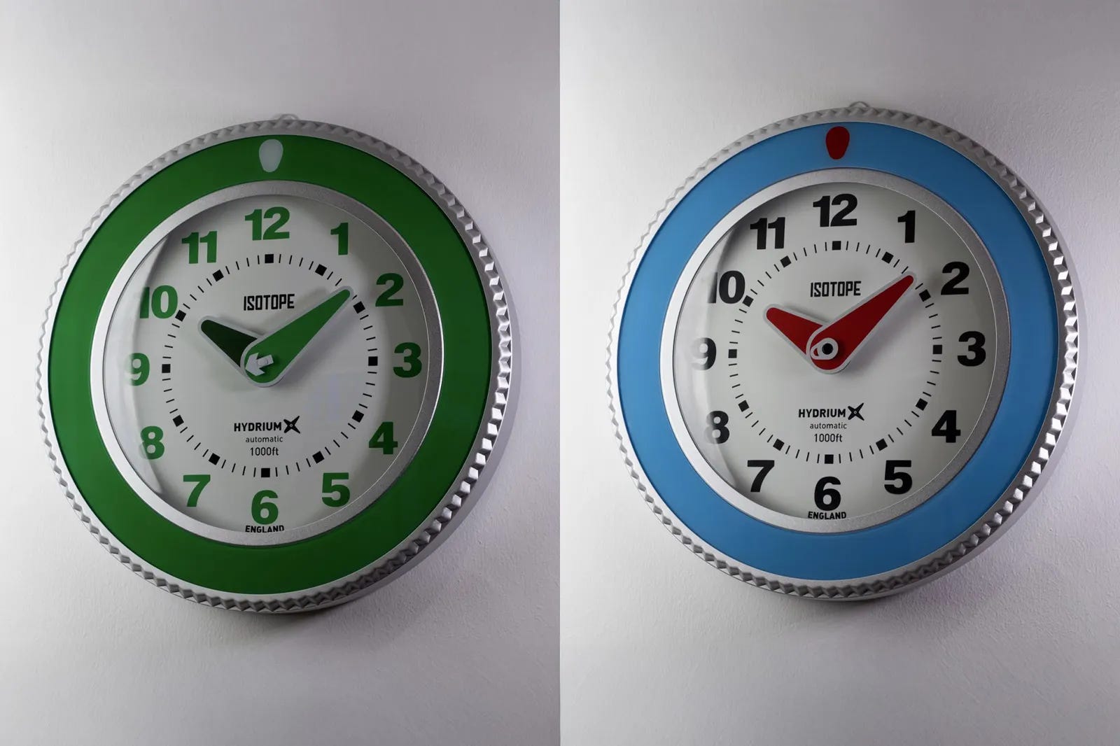 Isotope translates its Hydrium X design language into two wall clocks: Wall Return and Exit Clock. Wall Return evokes classic British shop signs with red hands and a blue bezel, while Exit Clock features a fully luminous green dial with a pictogram figure. Each measures 35cm in aluminum and runs on Seiko quartz, limited to 300 and 200 units respectively, at £244. The pair balances playful aesthetics with everyday functionality for distinctive decor.