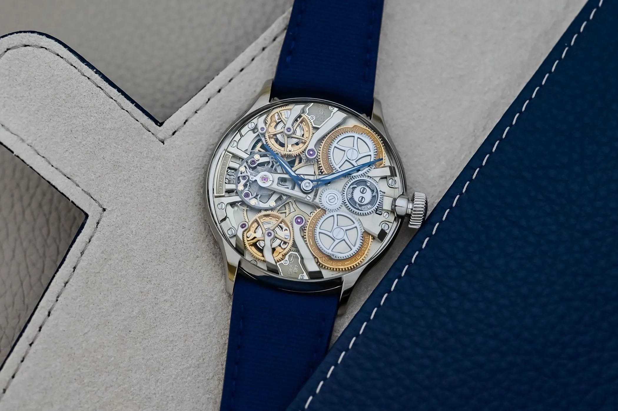 The Inverto Titanium showcases a fully inverted movement derived from the Central Impulse Chronometer, framed by a highly domed sapphire for a dramatic 3D effect. The Grade 5 titanium case measures 39 mm by 10.5 mm, with blued skeletonized hands ensuring legibility without obscuring the mechanics. Calibre 9019 employs dual barrels and twin remontoirs, releasing energy in 15‑second increments for stability and precision. Price: CHF 152,000.