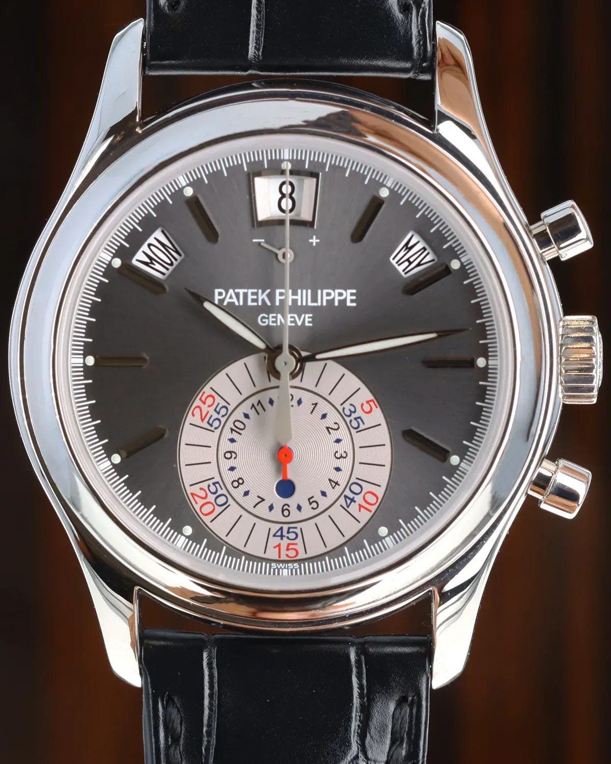 Visually, the platinum case gives the watch real physical presence, while the grey dial keeps it sober and formal. The signature layout is what collectors call the “monocounter” at six o’clock: a single subdial that consolidates elapsed minutes and hours for the chronograph, leaving the top of the dial to arc the annual calendar apertures for day, date, and month. It’s an unusual display that becomes surprisingly intuitive once you’ve worn it for a week—like learning the controls in a new car and then wondering why everyone else still uses knobs from 1997.
