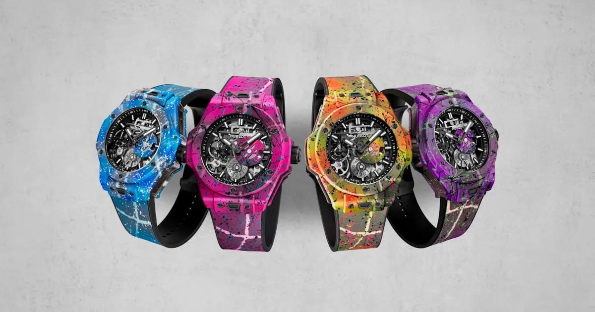 Hublot celebrates 20 years of the Big Bang with four vivid Meca‑10 Street Art editions, each limited to 10 pieces and cased in hand‑painted composite concrete. The openworked dials reveal the in‑house HUB1201 with a remarkable 10‑day power reserve. Bold colorways named “Magic City,” “Vice,” “Big Water,” and “Sunshine” channel street‑art energy while showcasing Hublot’s technical prowess. Price: $57,500.