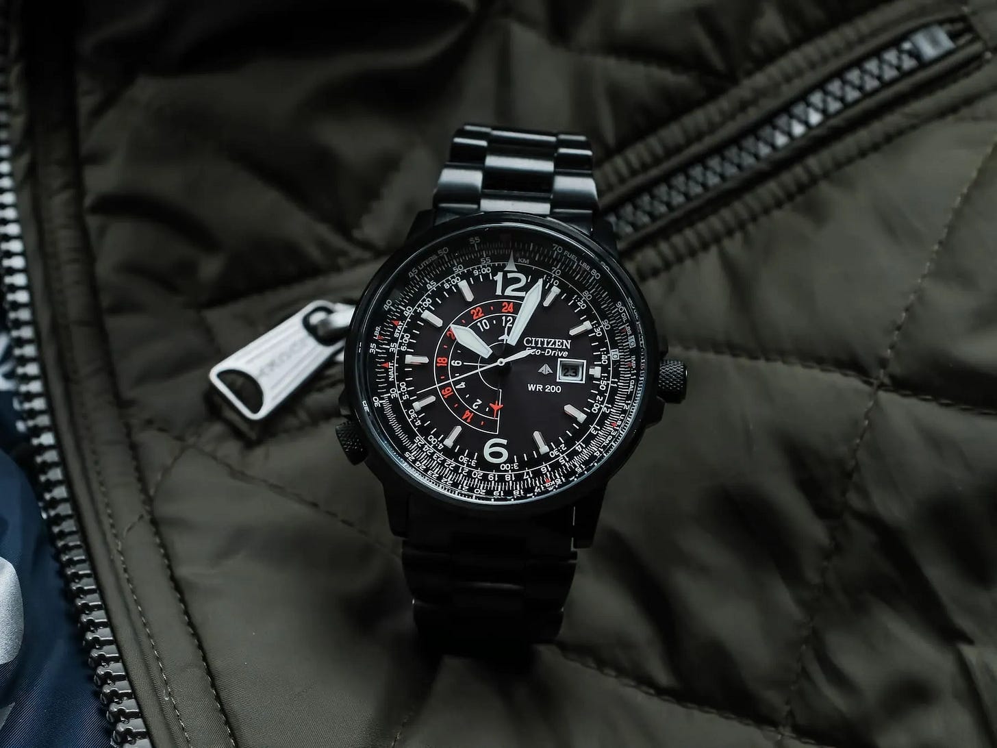 The blacked‑out JDM Citizen Nighthawk stands out as a bold, budget‑friendly GMT with a strong wrist presence thanks to its 42.5 mm black ion‑plated case. Its busy but well‑organized dial, E6B slide rule bezel, and 200 meters of water resistance make it a highly functional tool watch despite the use of a flat mineral crystal. Inside, the solar‑powered Eco‑Drive B877 movement delivers reliable quartz accuracy and long autonomy between light exposures. At $488 USD, it offers distinctive style and capability that can win over collectors even on a second encounter.