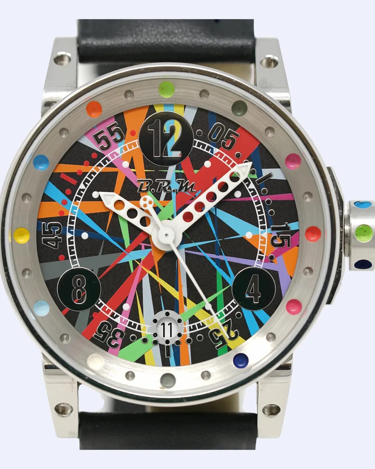 Launched as part of B.R.M’s Art Car series—an homage to the wild paint-splashed race cars made famous by artists and manufacturers across endurance racing—the V7-38-G extends the brand’s already eccentric DNA into full technicolor. The 38mm steel case is compact by B.R.M standards, giving it an unexpectedly wearable footprint. The rotating bezel is served with rainbow accents, a cue that prepares the eye for the dial’s explosion of color: multicolored Arabic numerals, “Automobile”-style hands shaped like miniature parts off a race car, and a 60-minute scale integrated into the chapter ring. A date window at 6 o’clock gives the design just enough practicality to pretend this is still a watch for everyday use. The leather strap, black with multicolored stitching, finishes the theme without losing the race-garage grit that makes B.R.M feel like its own subculture.