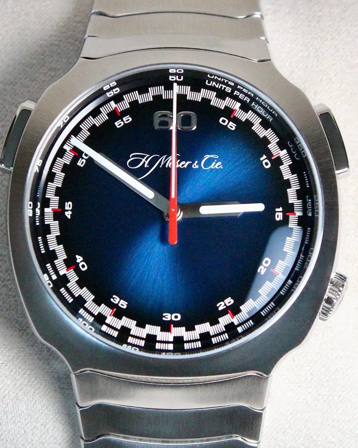If you like your chronographs modern, weirdly elegant, and just a little bit “future yacht club,” the H. Moser & Cie.Streamliner Flyback Chronograph (ref. 6902-1201) is one of the best arguments on the market. The 42.3mm steel case has that smooth cushion/bullhead attitude that made the Streamliner line such a left turn when it arrived, and the blue “fumé” dial does what Moser does best: it looks like a color until you stare at it, then it becomes an atmosphere. The integrated steel bracelet is a big part of the appeal here—more jewelry than strap—and minor wear on bracelet and case is exactly what you’d expect on a watch people actually enjoy wearing (and the good news is: this model looks even better when it’s not afraid of fingerprints). The movement story is the real flex: Moser’s automatic flyback chronograph caliber (developed with Agenhor) is known for its high-end architecture—column wheel, flyback capability, and a very “collector-grade” mechanical personality, paired with a roughly 54-hour power reserve and 120m water resistance that basically dares you to use the chronograph for something other than timing espresso.