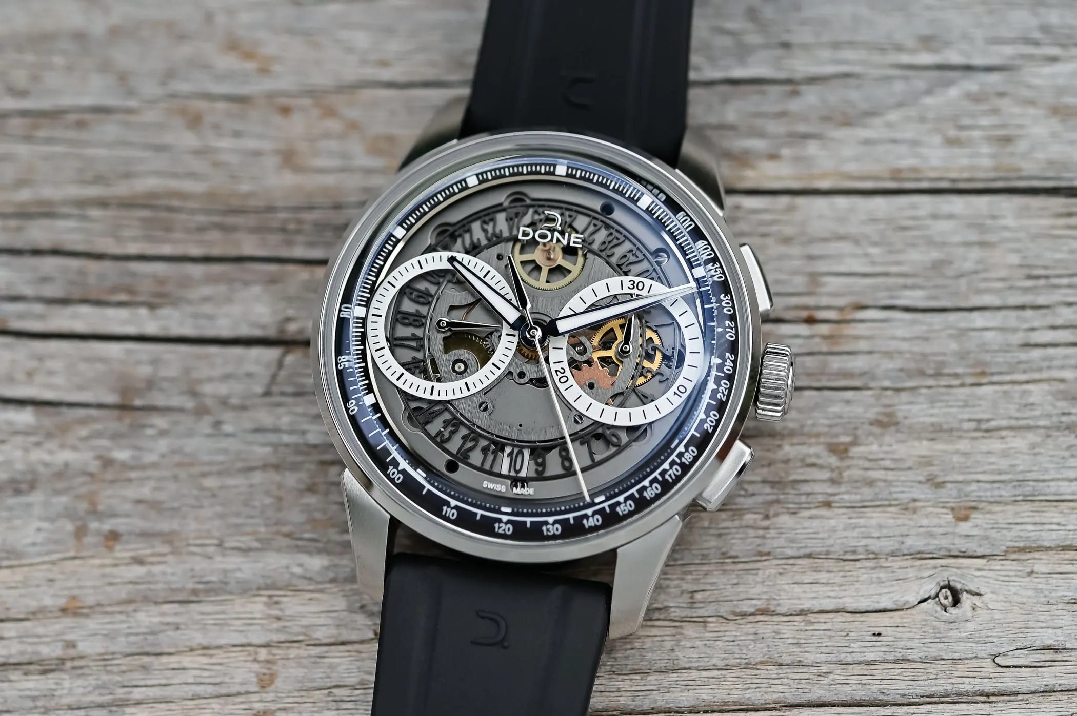 Done marks its tenth anniversary with an openworked 40 mm chronograph featuring a sapphire dial and LJP L111 automatic movement. The design blends vintage‑chronograph cues with modern detailing, including a tachymeter scale and skeletonized date wheel. It offers 100 m water resistance and ships on FKM rubber or a bracelet. Pre‑order price: CHF 3,691.