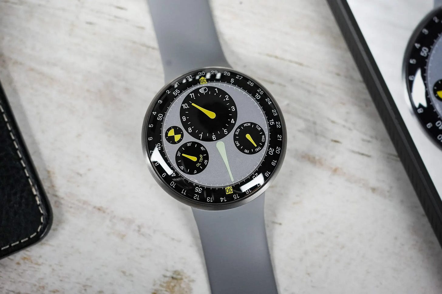 Ressence and Marc Newson present a greyscale Type 3 accented with high‑visibility yellow, evoking industrial signage. The ROCS display uses rotating discs within an oil‑filled chamber for remarkable visual depth, while an ETA 2824/2 base provides a 36‑hour reserve. Limited to 80 pieces in titanium with 10 m water resistance. Price: CHF 46,000.