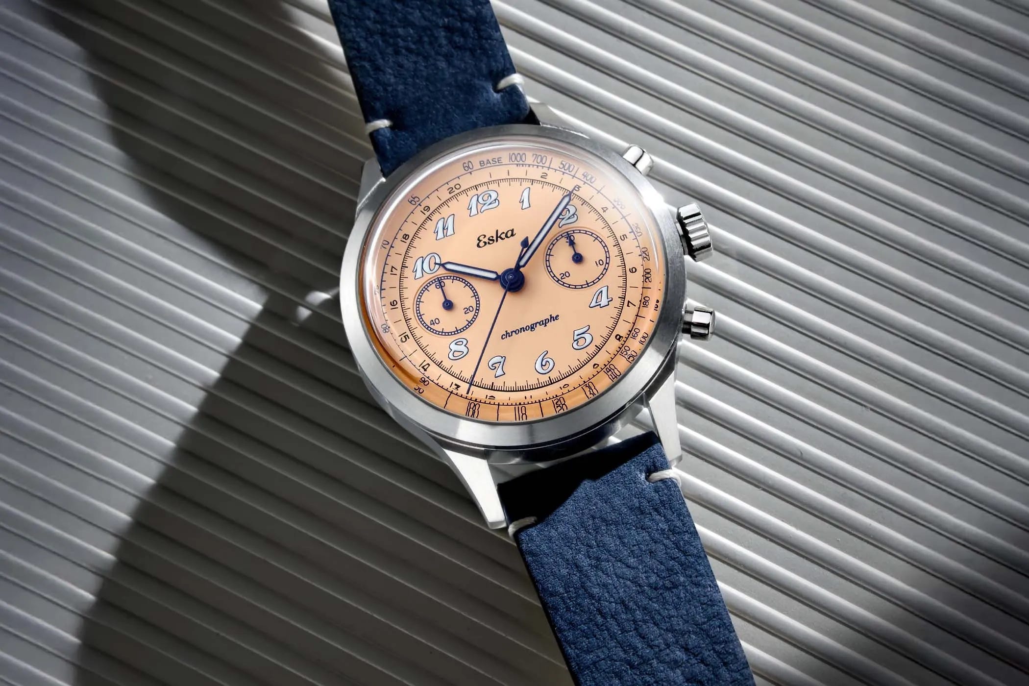 Eska returns with the Racing Chronograph Automatic, a 41 mm bi‑compax chronograph offered in Racing Azur and Racing Sunset styles. It pairs vintage‑inspired design cues with modern assembly in France and a dependable SL4617 automatic movement, a clone of the 7750, with a 45‑hour power reserve. The watch ships on a stitched leather strap with a travel pouch, emphasizing accessibility and everyday wear. Price: EUR 408 before taxes.