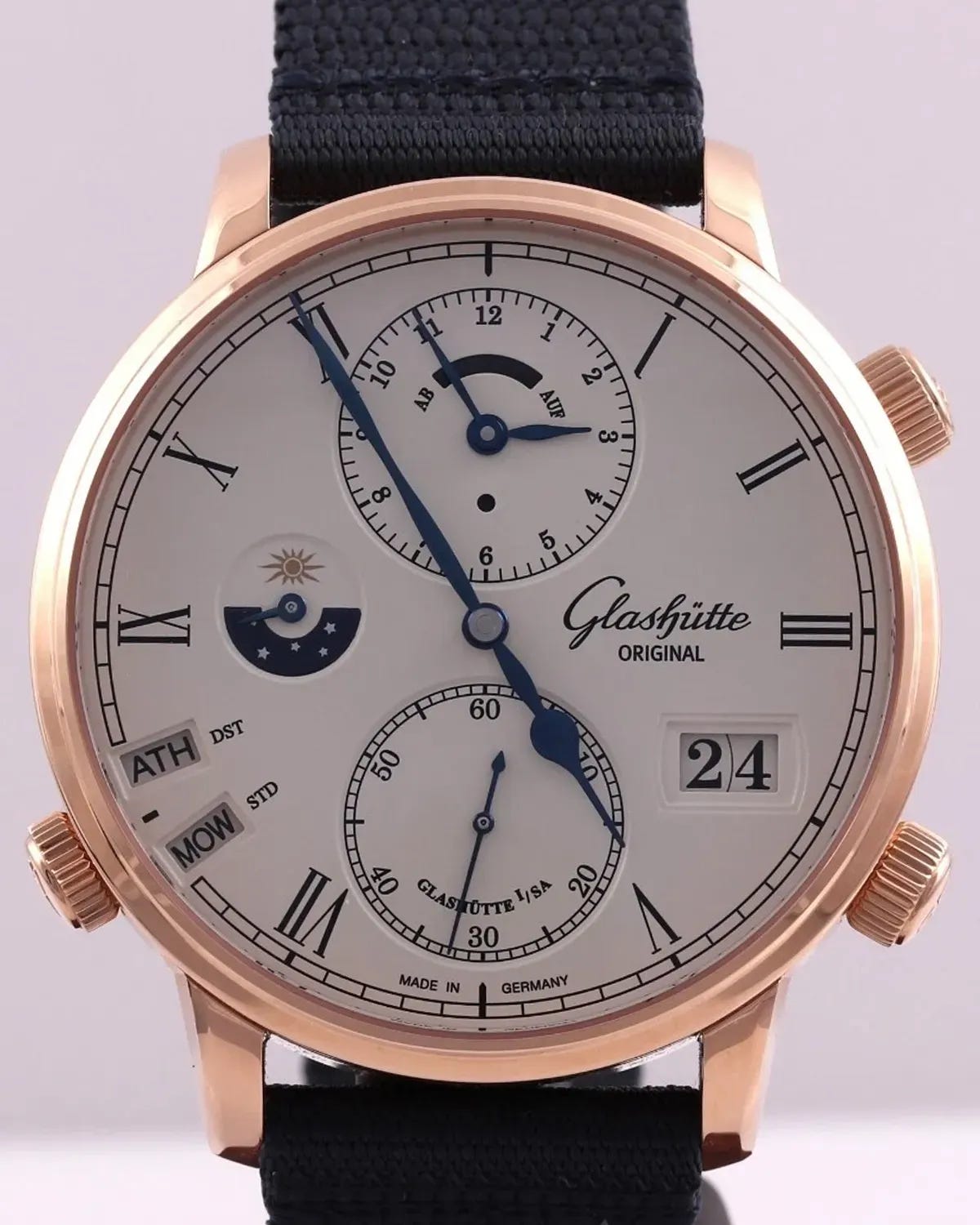 If you’ve ever looked at a GMT watch and thought, “Cute, but what about the other 34 time zones I actually don’t visit?” the Glashütte Original Senator Cosmopolite was built for exactly that kind of ambition. This is the brand’s high-function travel flagship: a big 44mm rose gold case, a grained silver dial that’s doing a lot of work, and the signature Cosmopolite party trick—two time zones shown at once, with a time zone ring that covers 35 world time zones and color-codes the oddball half-hour and three-quarter-hour offsets. Glashütte Original also bakes in DST/STD logic so you’re not guessing whether a city is on summer time, and it rounds out the “I fly for a living (or cosplay it)” toolkit with Panorama Date and a power reserve display.