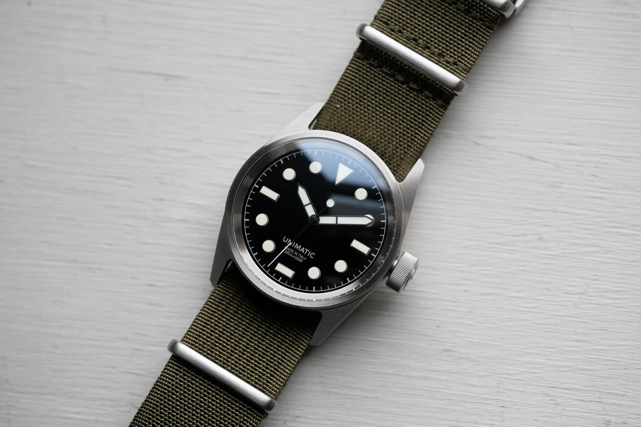 The Unimatic Modello Cinque U5S-BL introduces a fresh twist with its innovative “UNILIGHT” three-dimensional luminous markers, enhancing the depth of the dial compared to previous models, with a compact 36mm case and a unique 22mm lug width designed for smaller wrists while maintaining appeal for larger wearers. The deep black dial contrasts beautifully with the solid luminous blocks and metallic silver outlines, creating an attractive aesthetic. The U5S-BL comes with an automatic movement and is priced at $1,390, featuring two strap options: an olive drab NATO strap and a black leather strap. The watch’s design has proven popular, with the 300-piece steel version selling out shortly after its release, highlighting the enduring appeal of Unimatic’s distinct style.