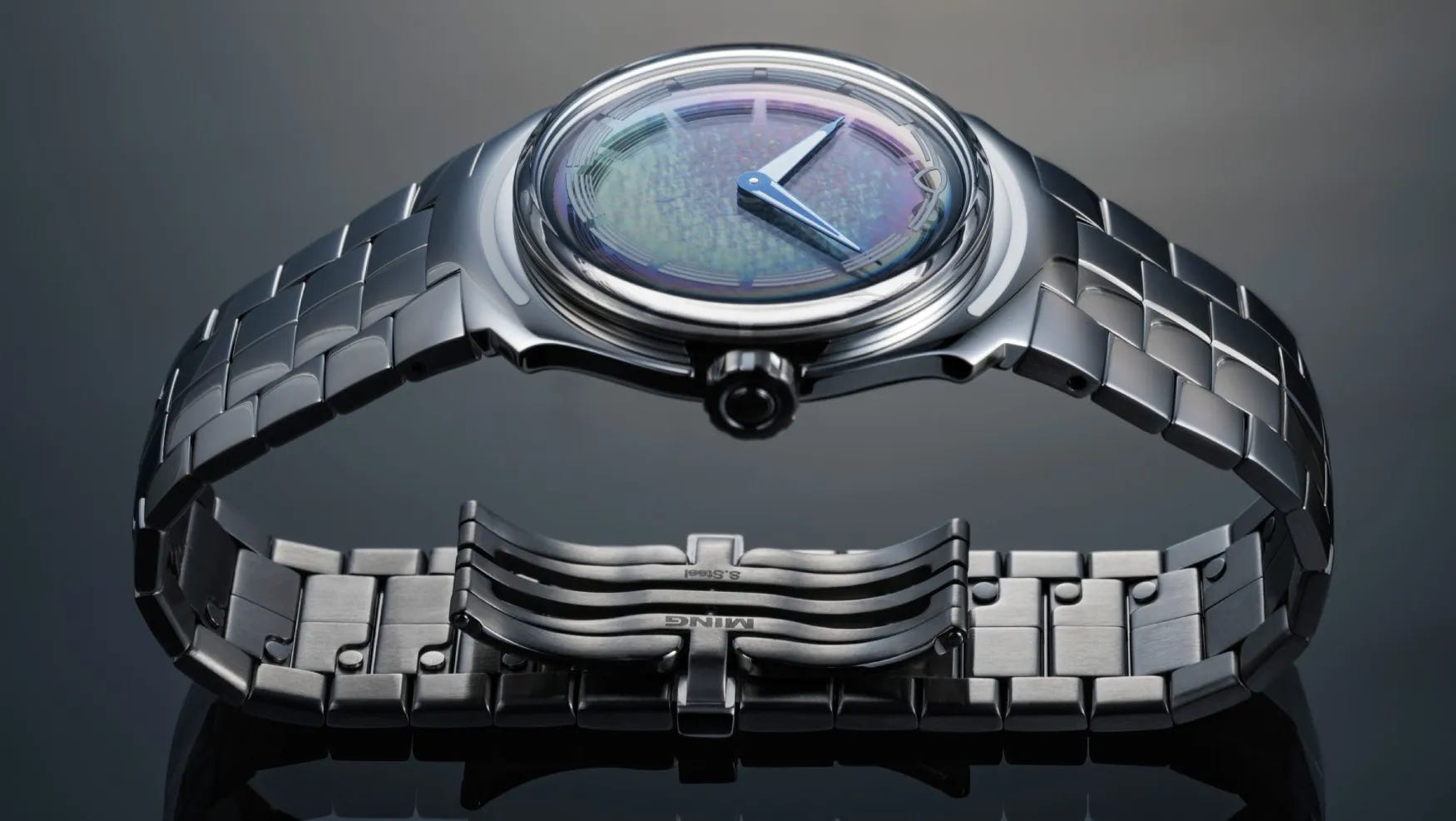 The 56.00 Starfield debuts MING’s first integrated bracelet, designed for comfort and featuring a toolless adjustment system tied to two pending patents. A Vaucher-based automatic calibre powers the watch, and the 40mm steel case is rated to 100m water resistance for genuine everyday use. The dial is a laser-etched sapphire design paired with blued dauphine hands, and the caseback reveals a custom lumed rotor. Limited to 20 pieces, it is priced at CHF 19,500 (about $25,155).