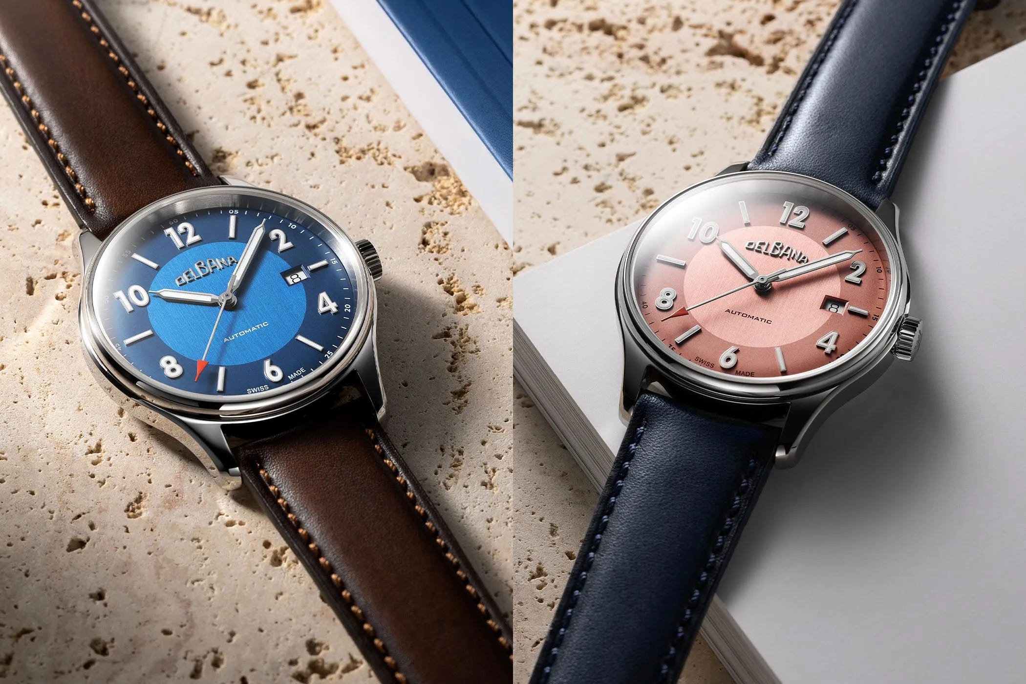 Delbana updates the Rotonda with four new monochromatic dial colors (mocha, purple, black, and blue) while keeping the distinctive central “rotunda” motif. The refreshed look adds larger luminous Arabic numerals and simplified markers, paired with retro syringe-style hands and a red-tipped seconds hand. The 40mm steel case is topped by sapphire, rated to 50m water resistance, and powered by the Sellita SW200-1 automatic movement. Pricing is CHF 870 on bracelet (about $1,122) or CHF 770 on leather (about $993).