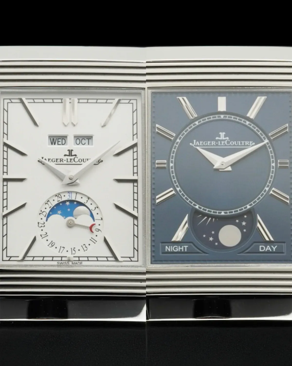 On the “front” (recto), you get a restrained, classical Reverso dial in silvered grey with a complete calendar layout and moonphase—day, date, month, and moonphase are all there without turning the watch into a cluttered infographic. On the flip side (verso), the personality changes: a deep blue sunray dial with a second time zone and a day/night indicator, so the Duoface complication is doing real work, not just giving you a different color to stare at. The movement is Jaeger-LeCoultre Calibre 853, manual winding, which is exactly what you want in a Reverso—thin, traditional, and built for this case architecture.