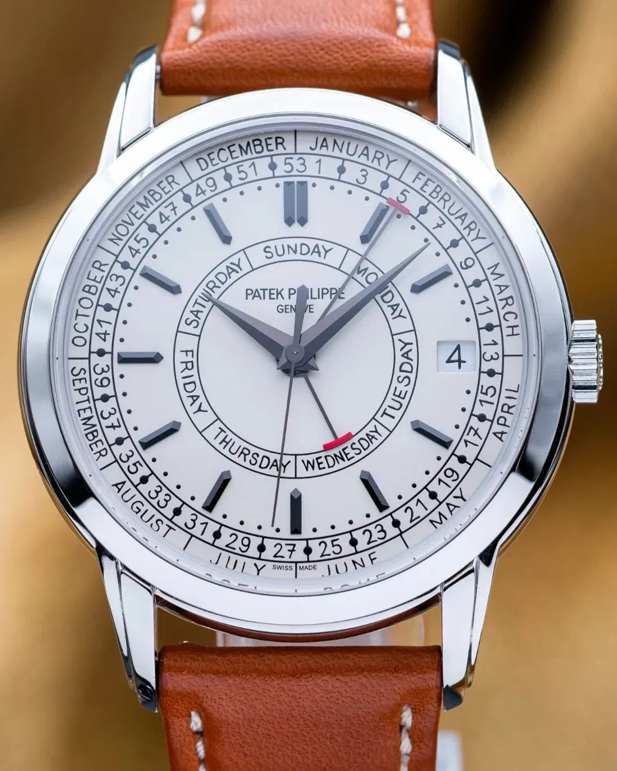The lot on deck is the Patek Philippe Calatrava Weekly Calendar ref. 5212A-001 in stainless steel with the brand’s silvery opaline dial and that unmistakable “handwritten” typography. It’s a complication packaged like a daily planner with delusions of grandeur: day and date are joined by a central hand that points to the week number, because apparently we all needed one more way to feel judged by the calendar. Patek positions the concept explicitly around the “paper diary” vibe, with the week display as the headline feature.