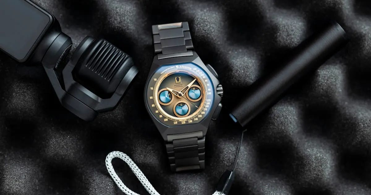 The Isotope Moonshot Chronograph “Terra Maris” is a striking timepiece that merges a sporty aesthetic with a unique design inspired by the shoreline of Portugal. With its light brown to black gradient dial, the watch features chronograph subdials capped in bright metallic blue, presenting a modern yet unconventional look. Crafted from grade 5 titanium, the case and bracelet are sandblasted and treated to a flat black finish, ensuring durability and a sleek appearance. Despite its bold design, the Moonshot Terra Maris maintains functionality, with a clean dial layout that allows for easy readability.