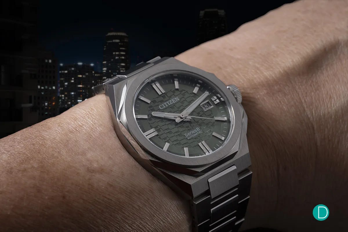 The Citizen Series 8 NB6080-51W is positioned as a sleek, modern mechanical watch with a slimmer profile, measuring 39.3mm wide and 10.4mm thick, making it especially wearable on smaller wrists. The pistachio-green dial takes inspiration from Tokyo’s night skyline and is designed to stay both stylish and legible. It runs on Citizen’s Cal. 9051 automatic movement, offering strong anti-magnetic performance, a 42-hour power reserve, and a 28,800 bph beat rate. A three-link bracelet and bi-folding clasp round it out as a daily-wear competitor in its segment.